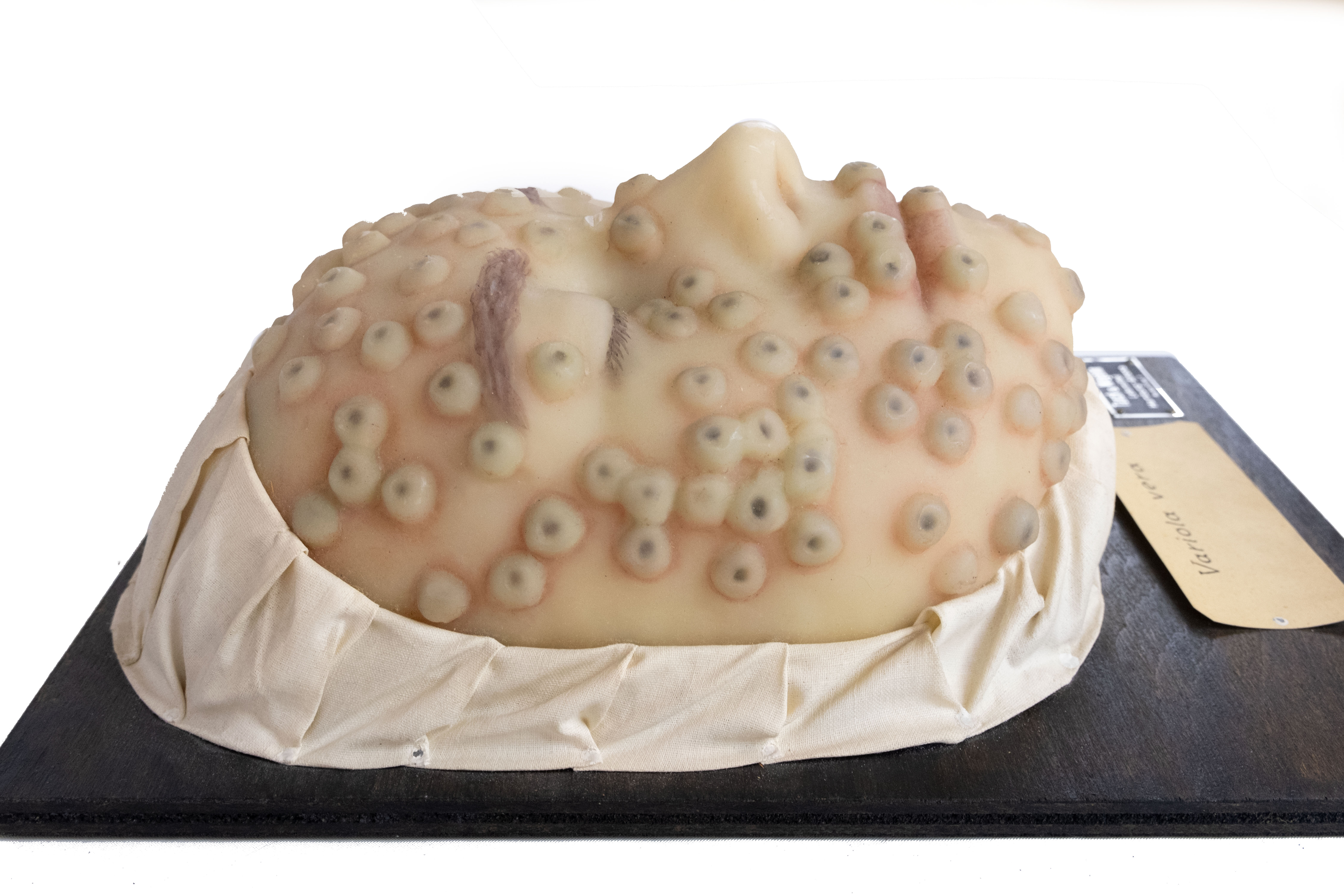 Modelo en cera policromada. Viruela con pústulas evolucionadas.