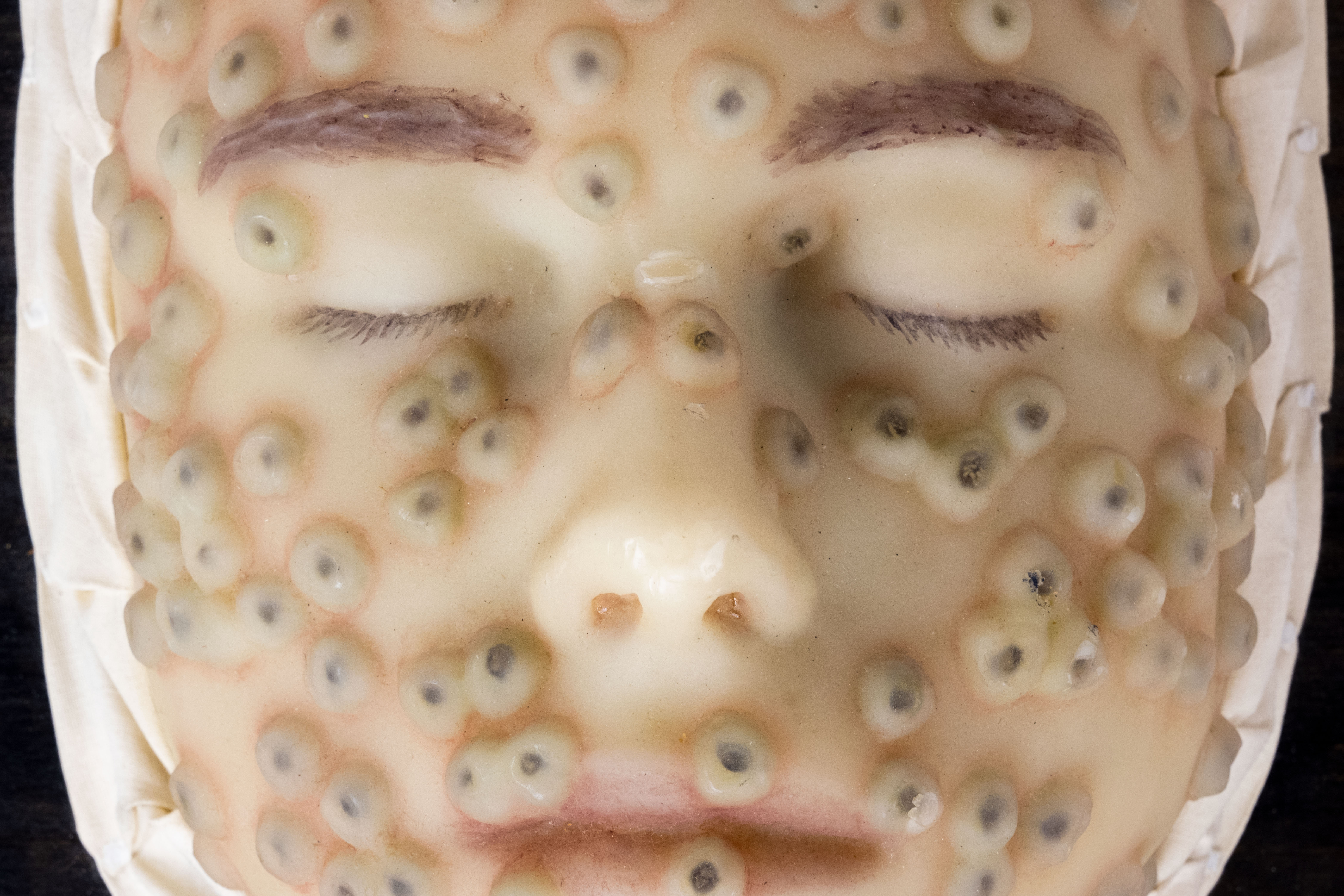 Modelo en cera policromada. Viruela con pústulas evolucionadas.