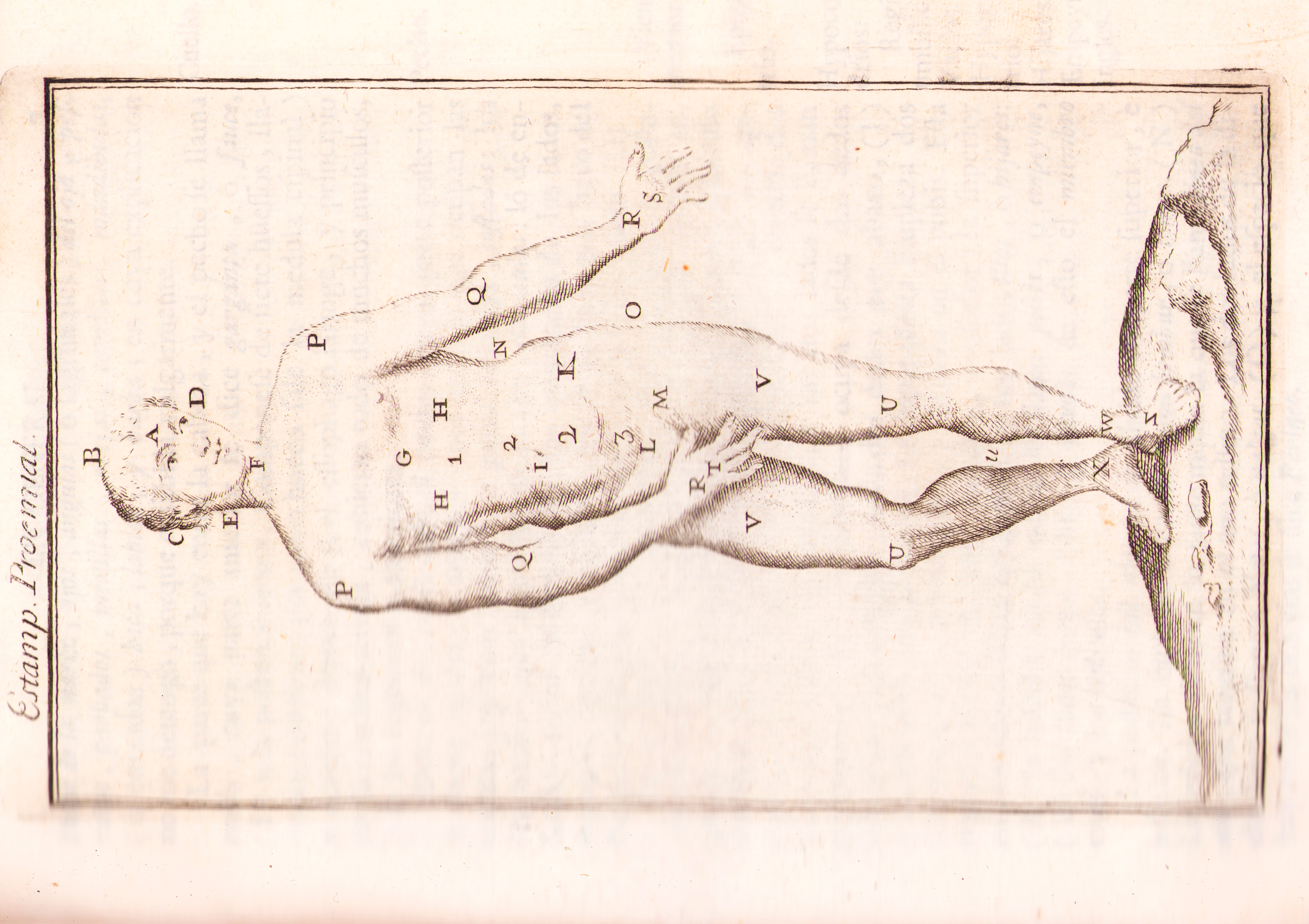A. Mollera, B. Coronilla, C. colodrilo, D. Sienes, E.Nuca, F.Garganta, G.Hoyo del corazón, H. Hypocondrios, I. Ombligo, K. Ylos, L. Pubis, M. Ingles, N. Lomos, O. Nalgas,P. Hombros, Q. Flexura del codo, R. Carpo, S. Metacarpo o palma de la mano, T. Parte posterior del metacarpo, V. Muslos, U. Rodillas, W. Tarfo o empeine del pié, X. Tobillo, Y. Talón, Z. Metatarfo
