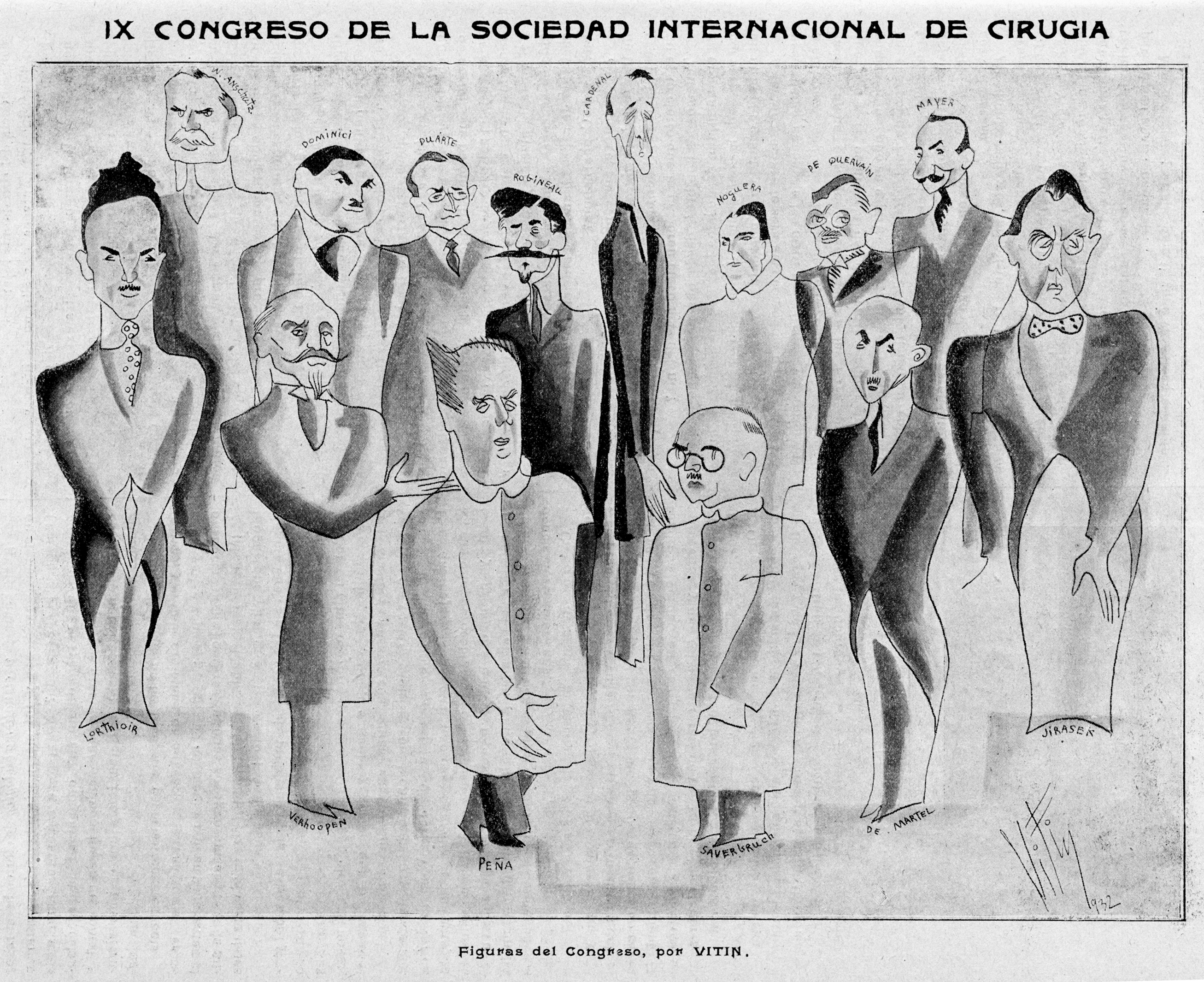 Figuras del IX Congreso de la Sociedad Internacional de Cirugía (1932). Caricatura por Vitin.