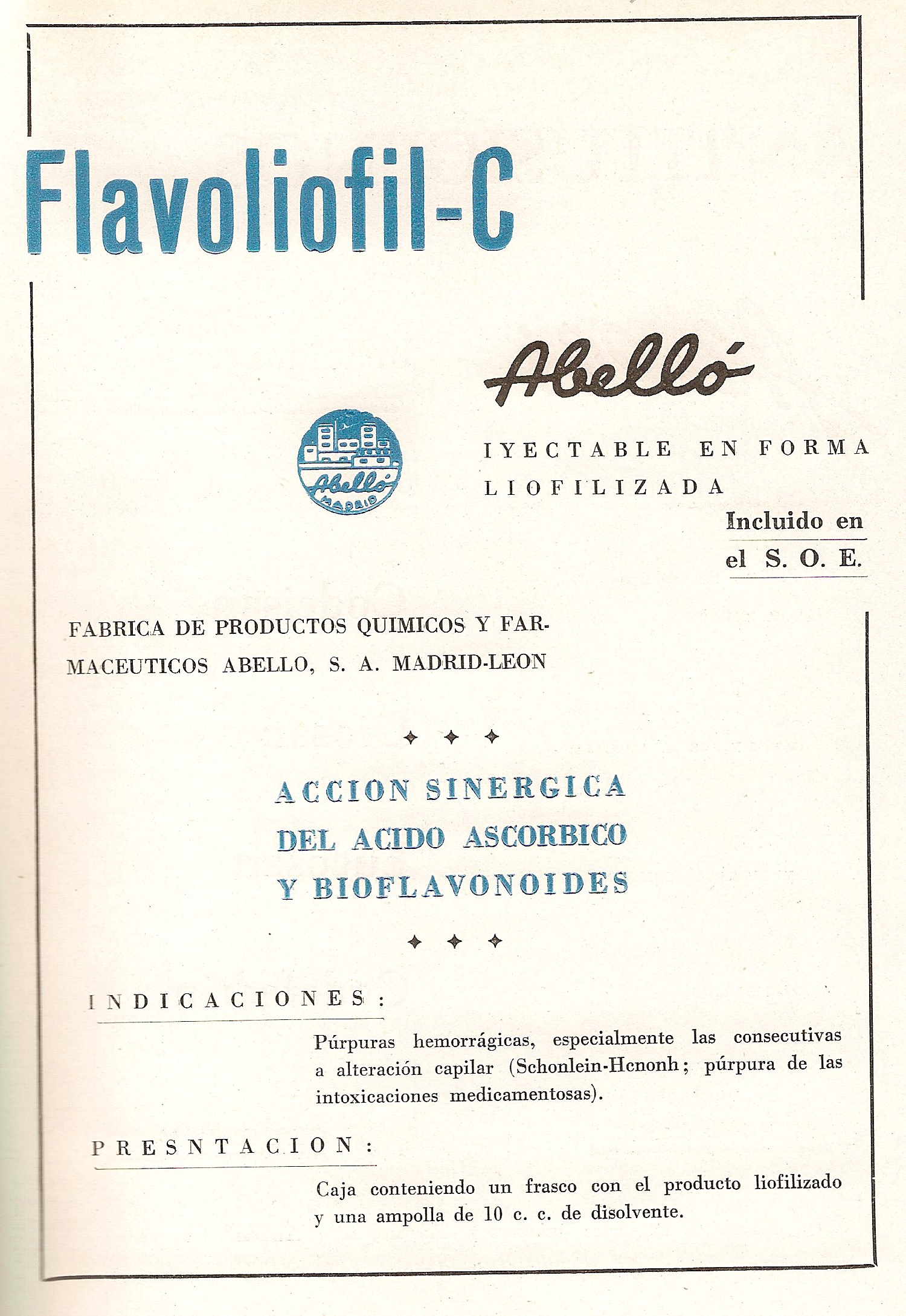 Flavoliofil-C. Acción sinérgica del ácido ascorbico y bioflavonoides. Abelló, S.A., León. Boletín de la Academia Médico Quirúgica Española, 27 de noviembre de 1961.
