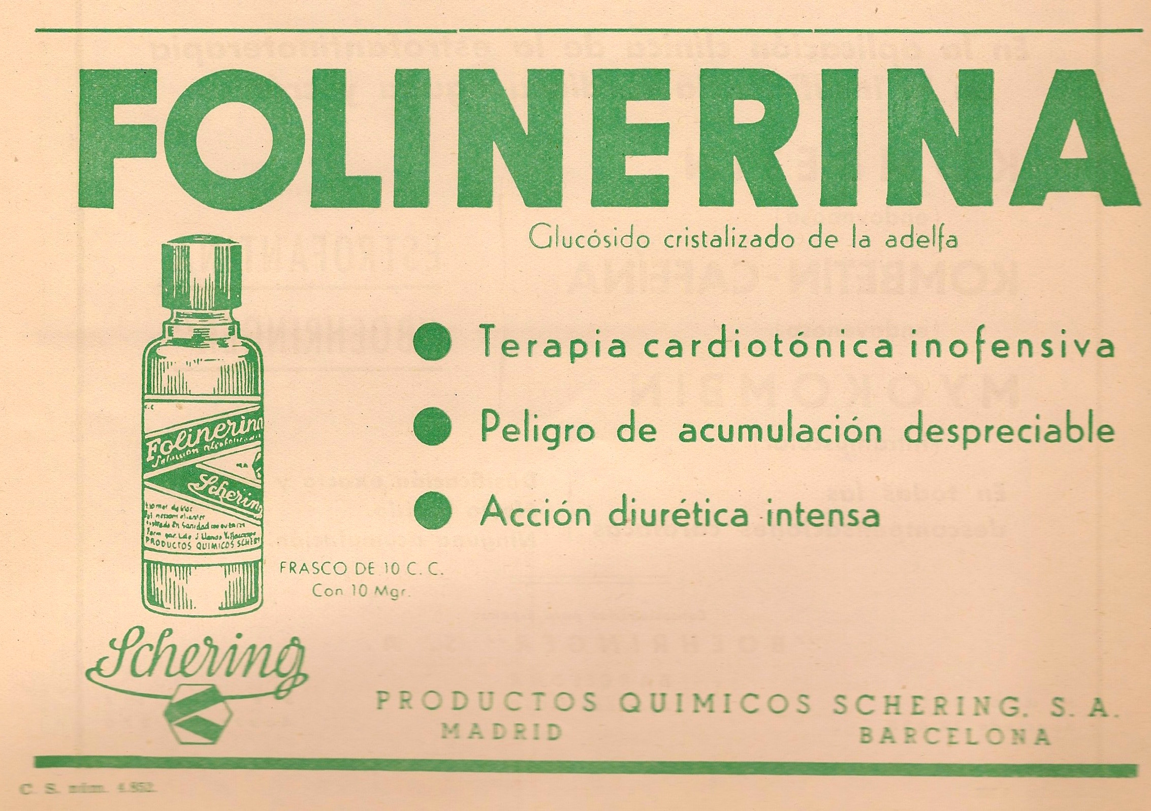 Folinerina. Gllucósido cristalizado de adelfa. Cardiotónico. Diurético. Productos Químicos Schering SA. Madrid, Barcelona. Publicidad aparecida en la revista Gaceta Médica Española. Año 18, número 2, 1944.