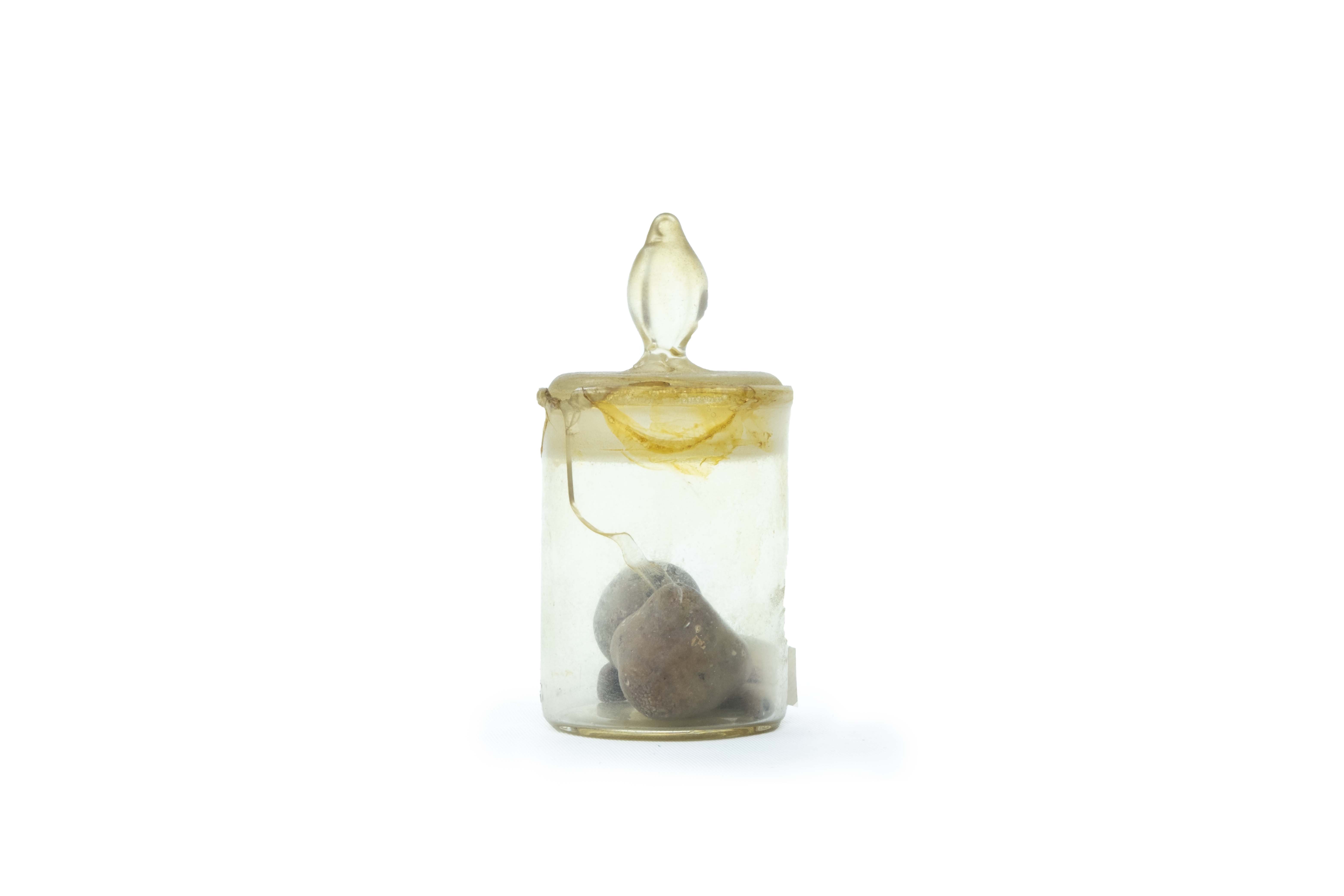Frasco de cristal con varias piedras (posiblemente cálculos)