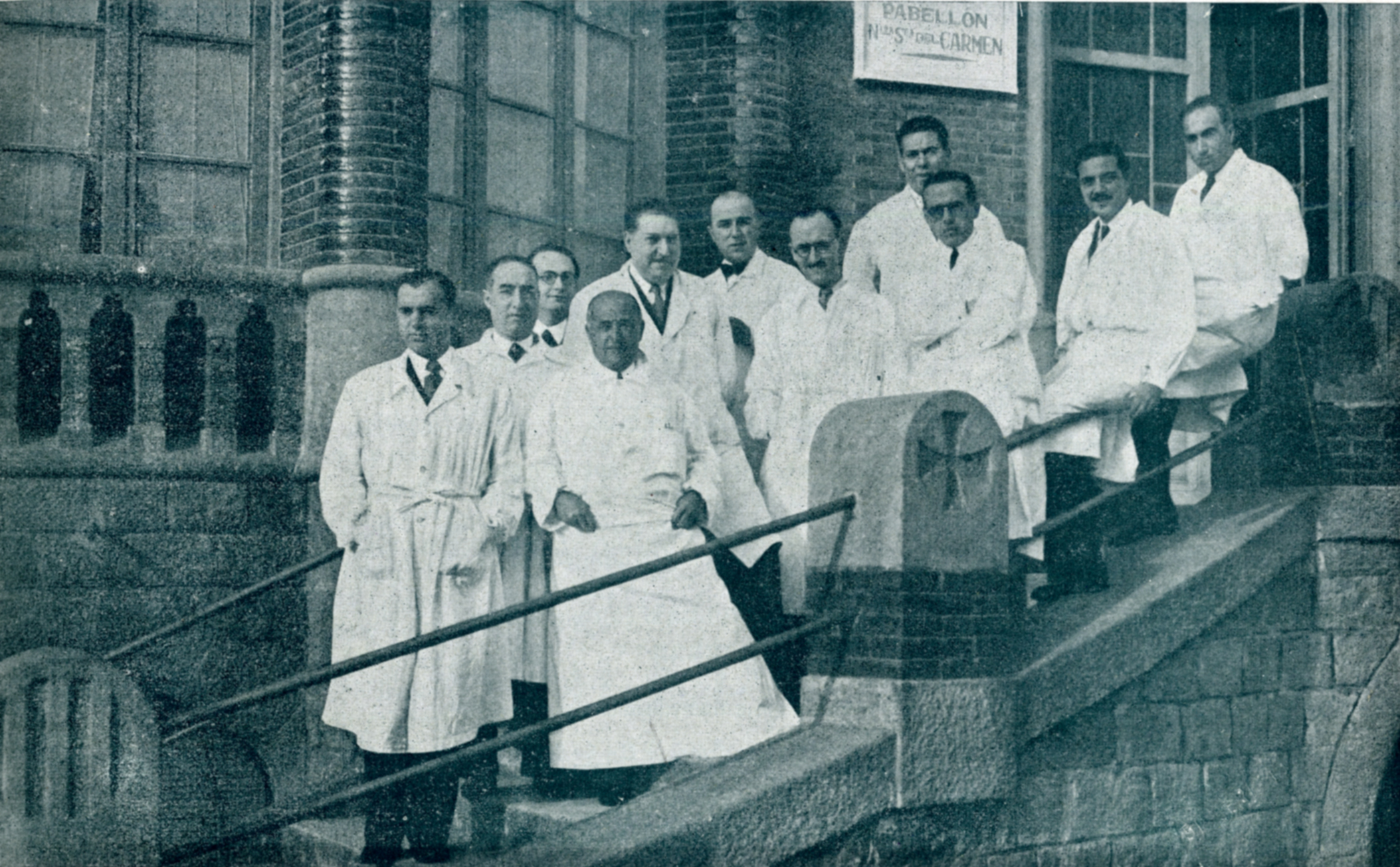 El profesor Gallart y el profesorado de la Escuela de Patología Digestiva del Hospital de Santa Cruz y San Pablo de Barcelona, posan ante el fotógrafo. Gaceta Médica Española, 89, Feb. 1934, 149-P