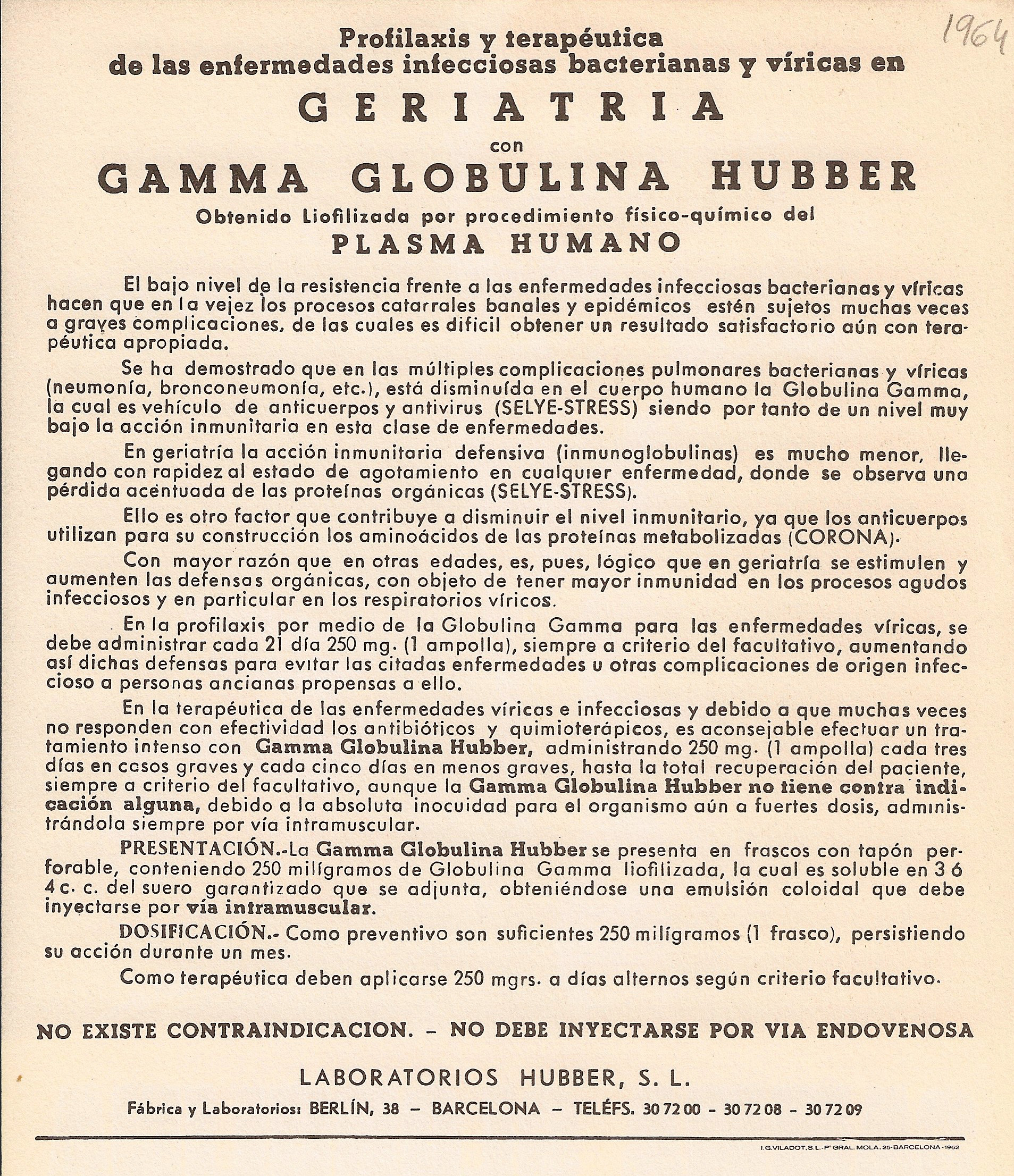 Gamma Globulina Hubber. Encarte en Archivos de la Facultad de Medicina de Madrid, 1964