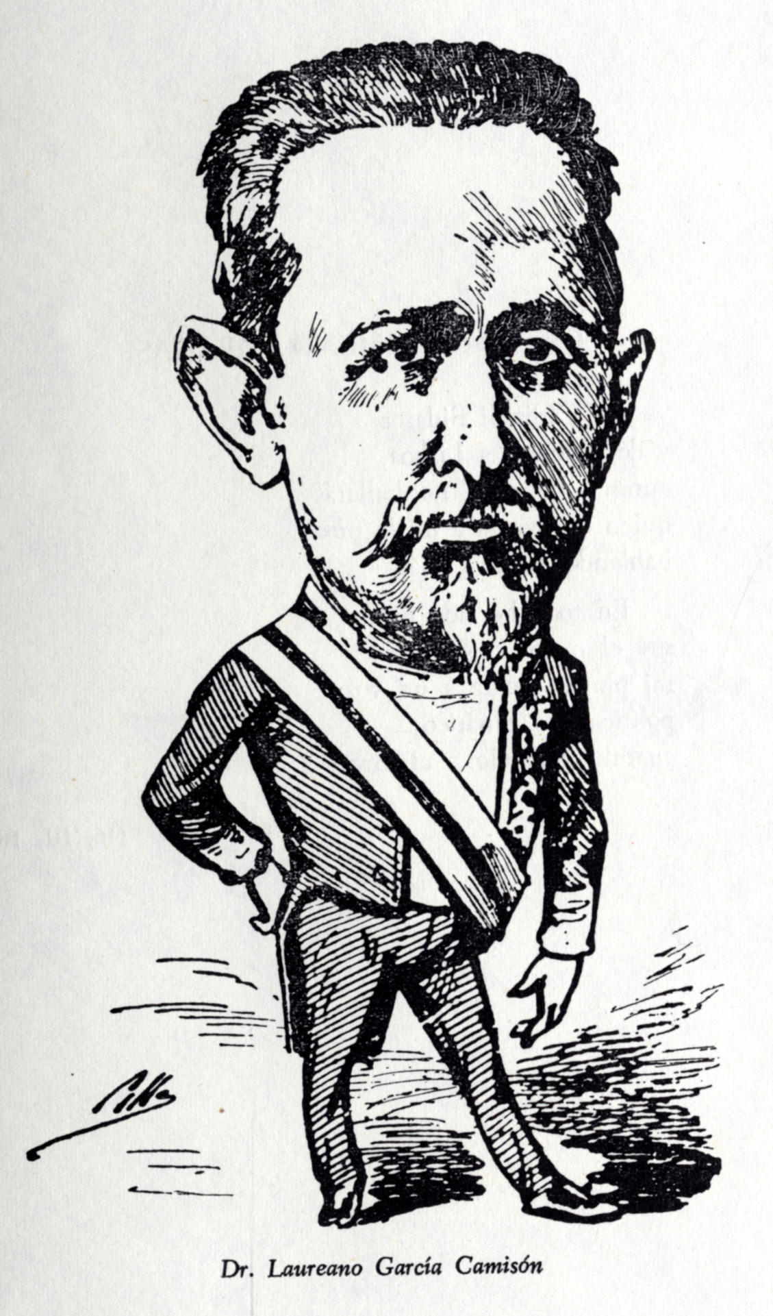 Caricatura del Dr. D. Laureano García Camisón y Domínguez (1836 – 1910), por Cilla, sacada del libro del Prof. D. Luís Sánchez Granjel, ‘Biografía de “El Dr. Sangredo” (1883-1884)’, que fue una revista médica del siglo XIX que se subtitulaba “Revista satírica quincenal. Dedicada a los hijos de Esculapio”. Pag. 85.