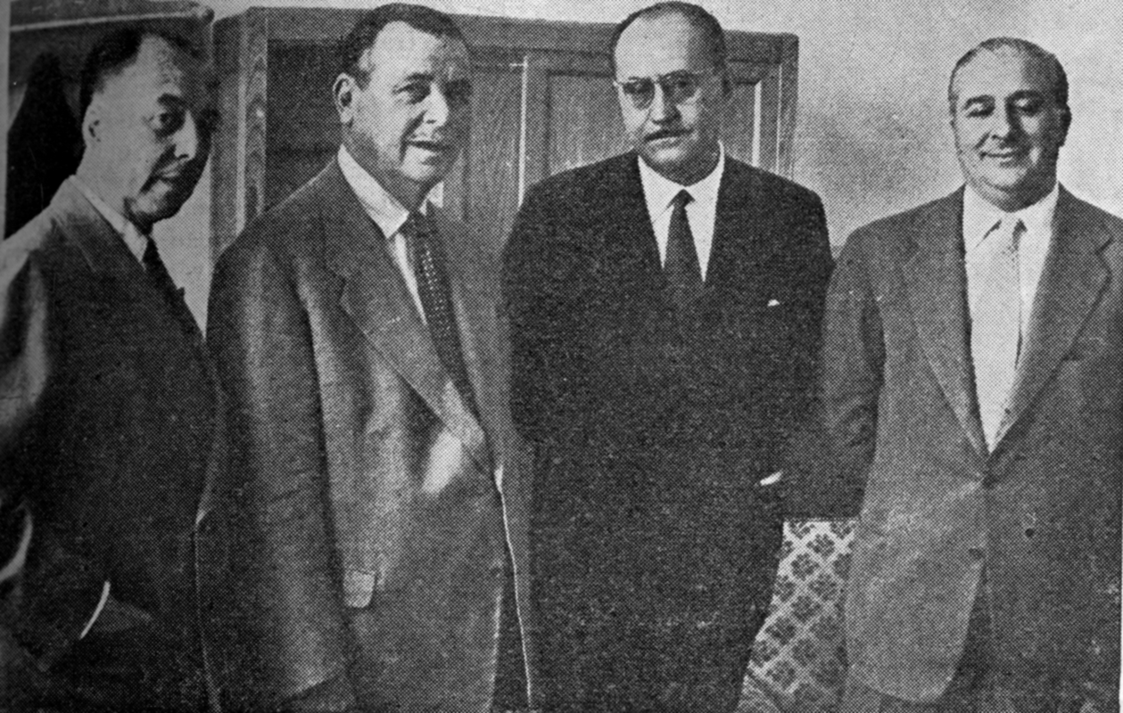 De izquierda a derecha, el profesor D. José Gay Prieto, el doctor D. José Alberto Palanca y Martínez-Fortún, el rector de la Universidad Central, doctor D. Ricardo Royo-Villanova y Morales, y el doctor Sáenz de Miera, jefe nacional del S.O.E. .Consejo General de Colegios Médicos de España, 102, Julio 1956