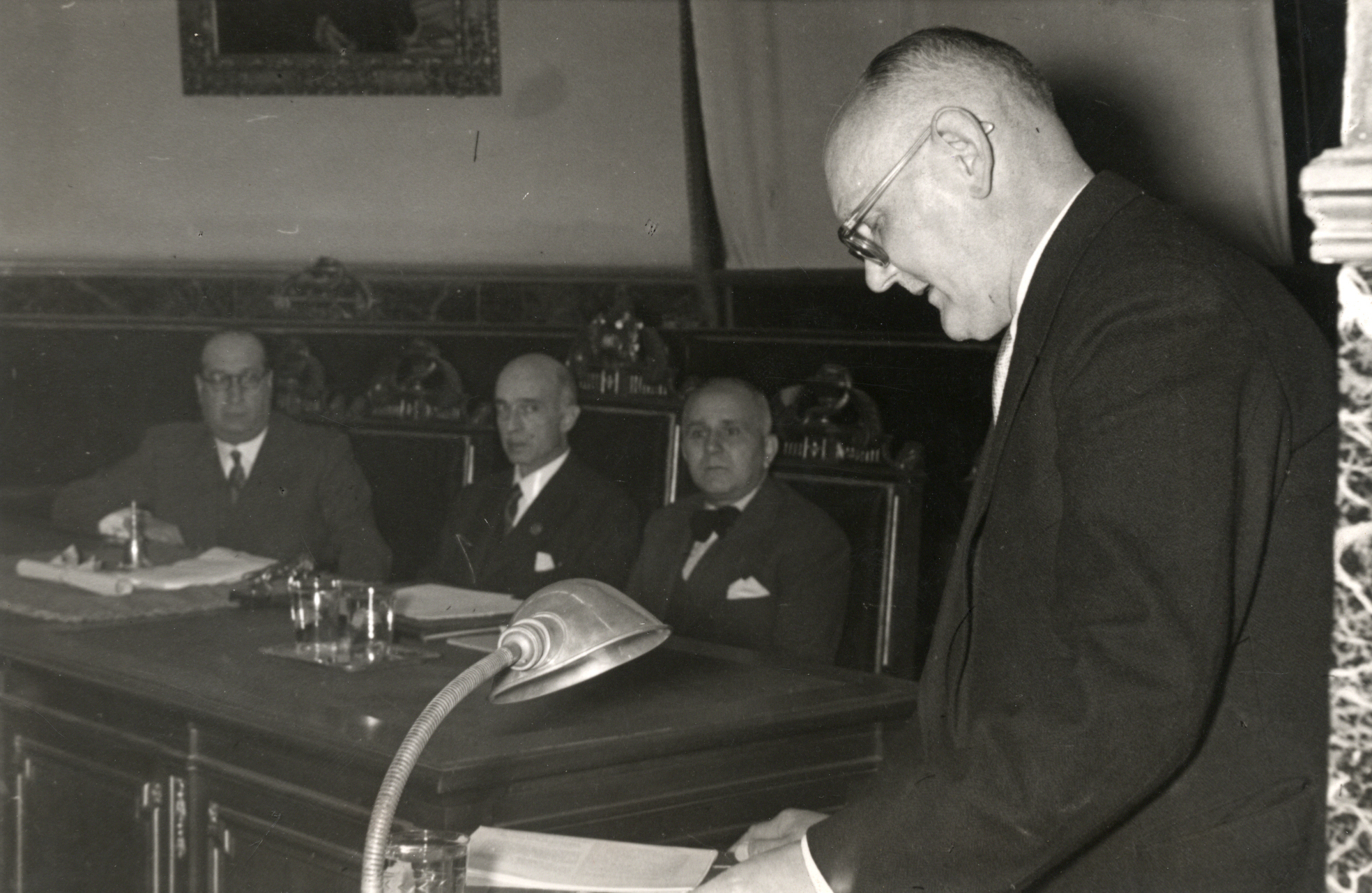 El 6 de Mayo de 1952, el Profesor Gerhard Domagk, polaco de nacimiento y alemán de nacionalidad, y Premio Nobel de Fisiología en 1939, pronunció una conferencia en la Real Academia Nacional de Medicina antes de recibir el cargo de Académico de Honor de la Corporación. Presidieron los Profesores Enríquez de Salamanca (centro de la mesa), Valentín Matilla (a su izquierda) y Carro (a su derecha).