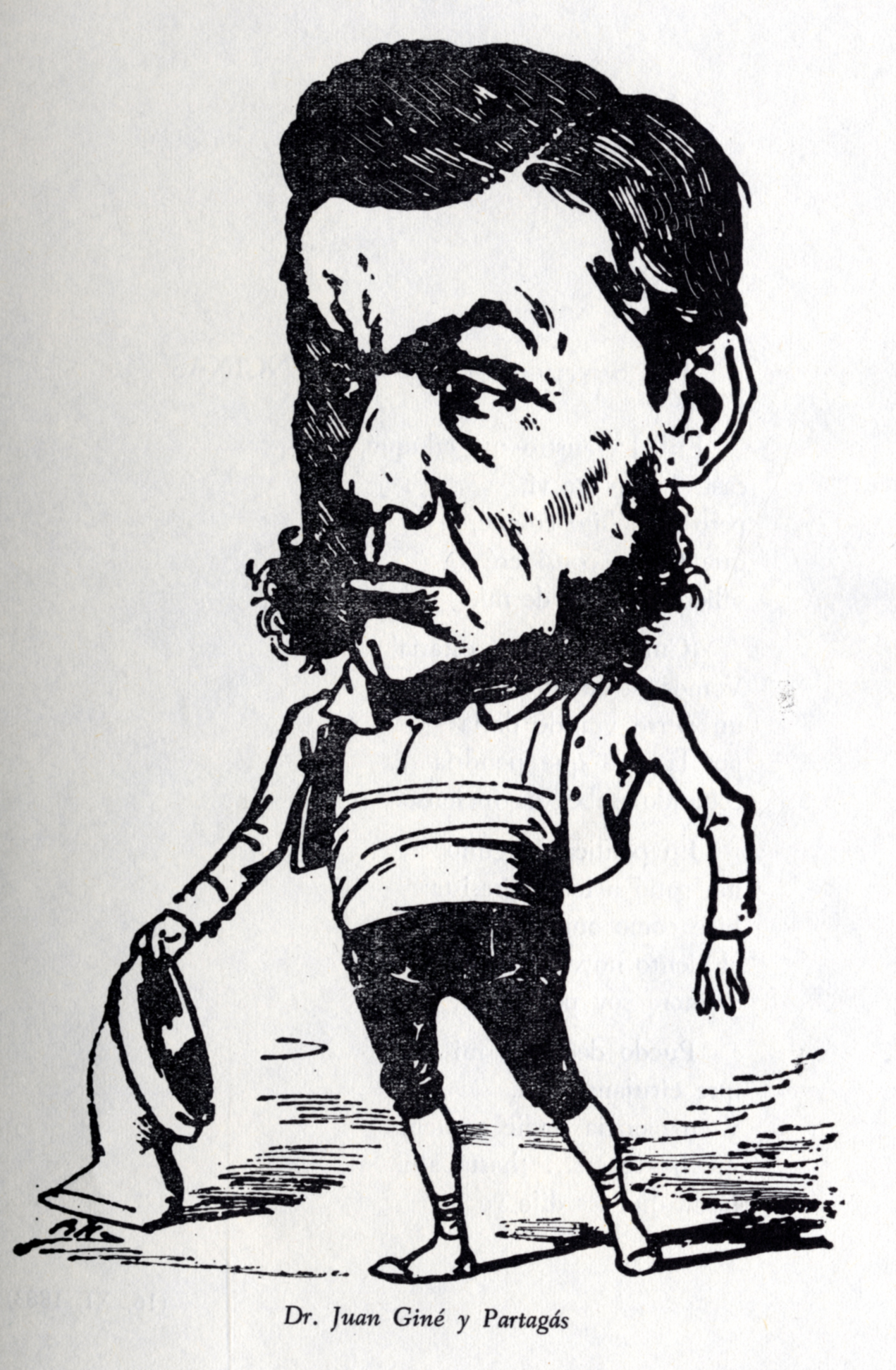 Caricatura del Dr. D. Juan Giné y Partagás (1836 – 1903), por Cilla, sacada del libro del Prof. D. Luís Sánchez Granjel, ‘Biografía de “El Dr. Sangredo” (1883-1884)’, que fue una revista médica del siglo XIX que se subtitulaba “Revista satírica quincenal. Dedicada a los hijos de Esculapio”. Pag. 89.