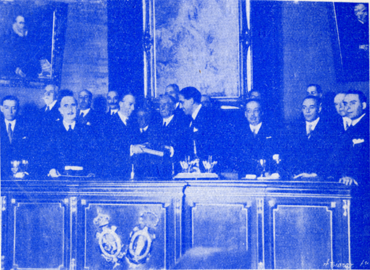 El doctor Marañón entrega el Libro Homenaje al doctor Goyanes. En la Mesa, el Presidente de la Academia, el Rector de la Universidad y el comité.
