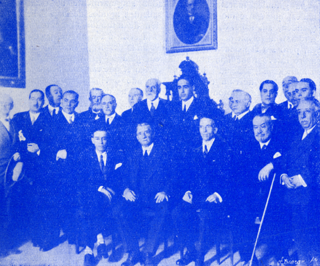 El doctor Goyanes rodeado del comité organizador y de algunos asistentes al acto del homenaje: doctores Recaséns, Marañón, señor Pérez de Ayala, Francos Rodríguez, Pittaluga, Carro, Oller, García Tapia, Marín Amat, Bolívar, Peña, Piñerúa, Herce y Noguera (J. y E.)