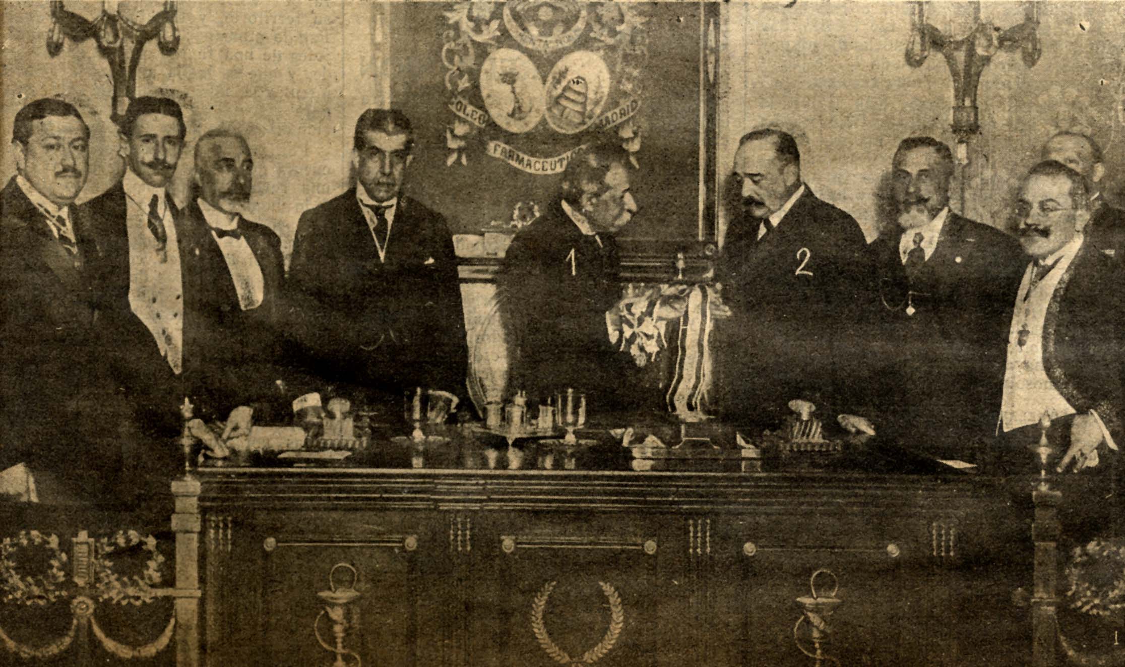 En un acto celebrado en el Colegio de Farmacéuticos de Madrid, D. Martín Bayod y Martínez recibe de manos del Prof. Rodríguez Carracido las Insignias de la Gran Cruz de Isabel la Católica, que se le han ofrecido por suscripción nacional.