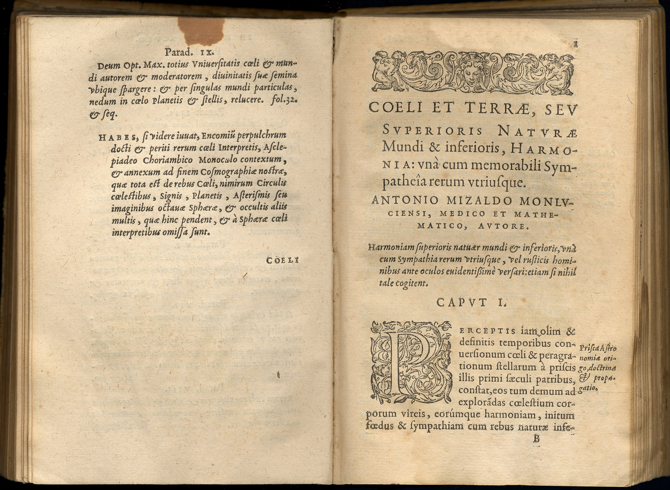 MIZAULD, Antoine (1510-1578). – Harmonia superioris naturae mundi et inferioris. – Parisiis : Ex Officina Federici Morelli, 1577. – [8], 36 h. ; 8º [17 cm.]. – Perg.