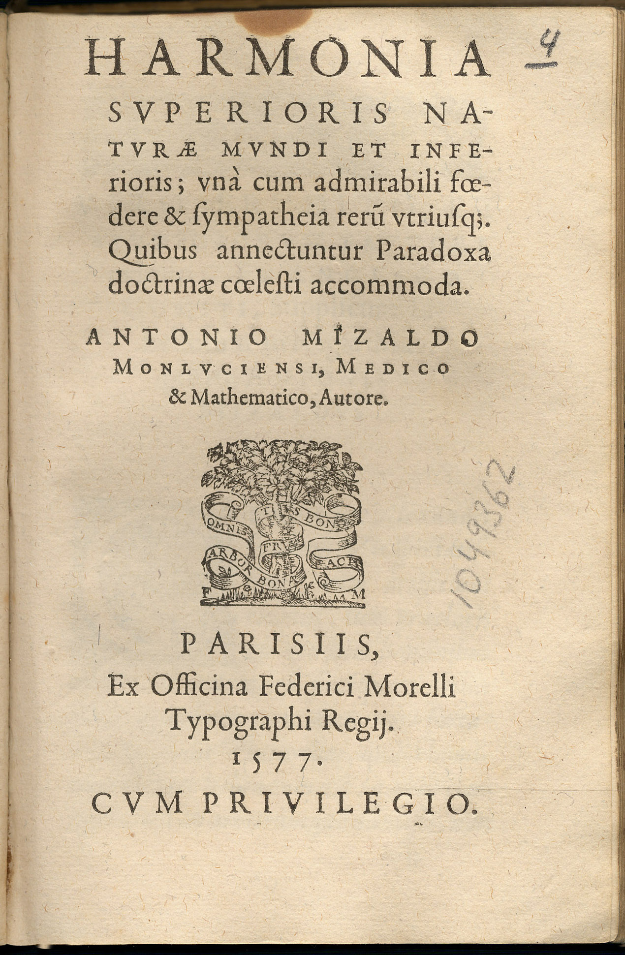 MIZAULD, Antoine (1510-1578). – Harmonia superioris naturae mundi et inferioris. – Parisiis : Ex Officina Federici Morelli, 1577. – [8], 36 h. ; 8º [17 cm.]. – Perg.
