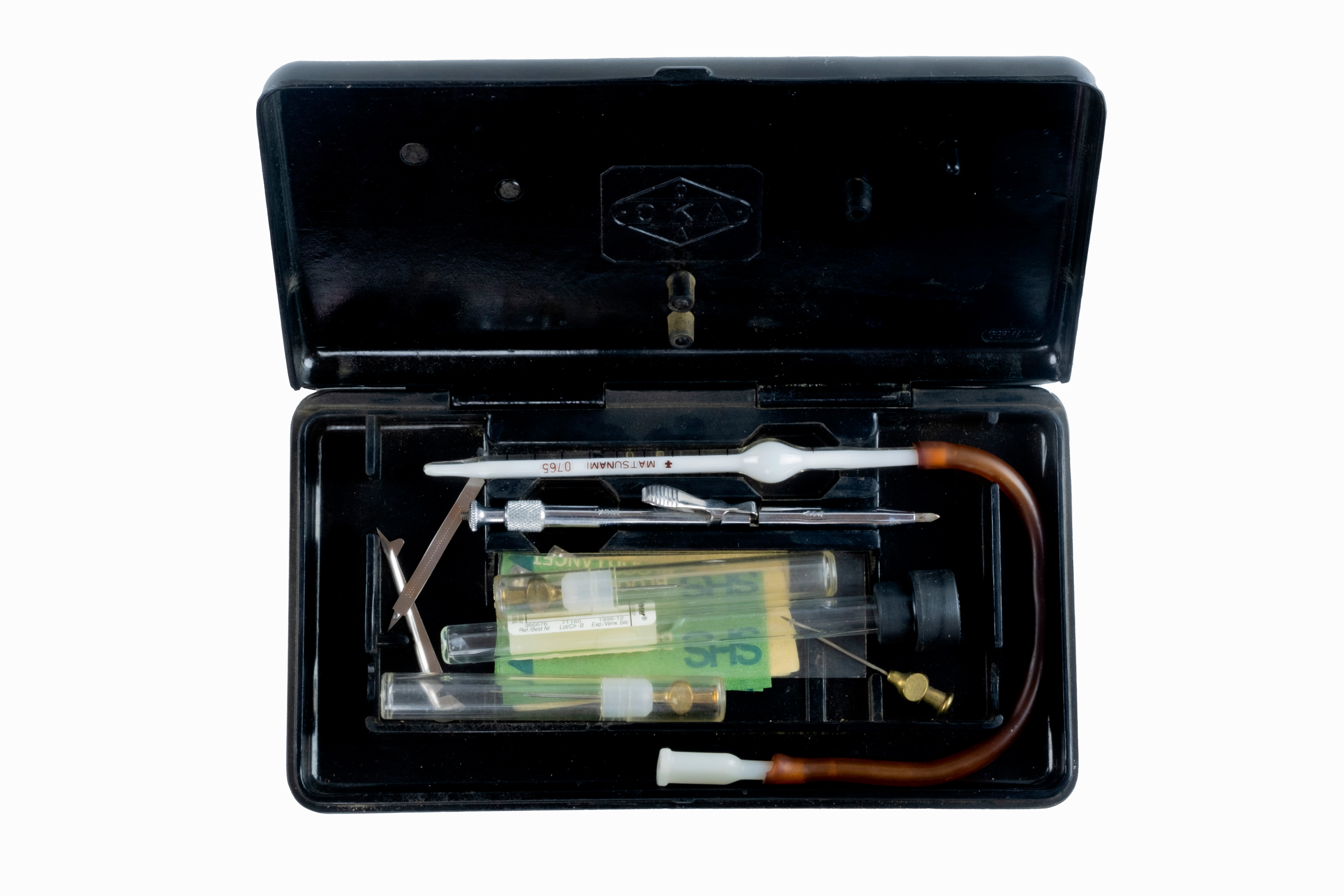 Estuche de plástico negro, contiene los accesorios del hemocitómetro, aparato que se utiliza para el recuento celular de la sangre. Entre otras cosas, contiene cuatro lancetas, tres agujas (dos de ellas metidas en pequeños estuches cilíndricos), un frasco con un líquido dentro, un medidor de cristal con una pequeña miedra en su interior y un tubo de goma insertada en él, un accesorio de acero cromado con una punta cortante y una placa de laboratorio de crista