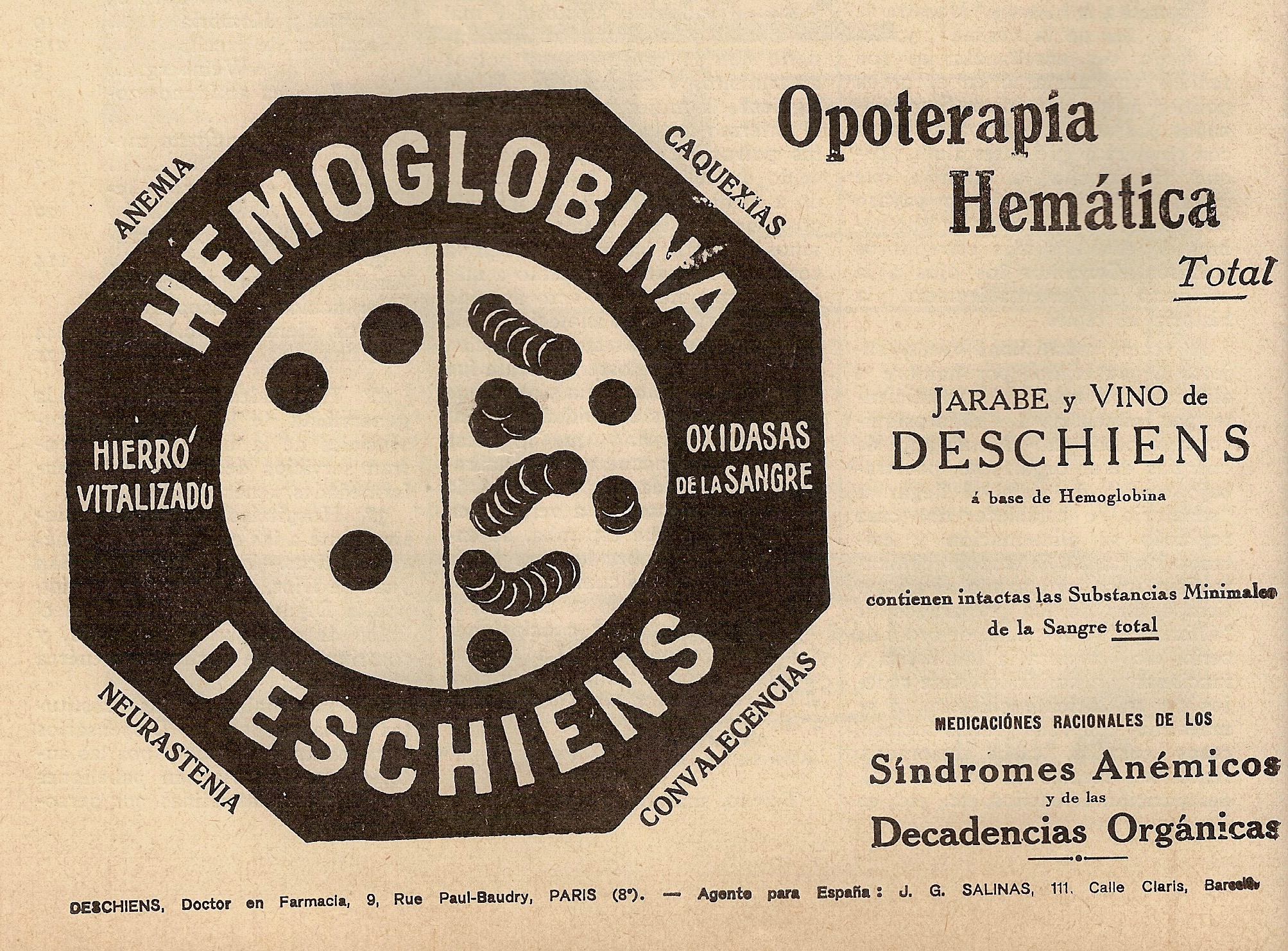 Hemoglobina Deschiens. Opoterapia hemática. Síndromes anémicos, decadencias orgánicas. La Medicina Íbera, 11 de abril de 1931.