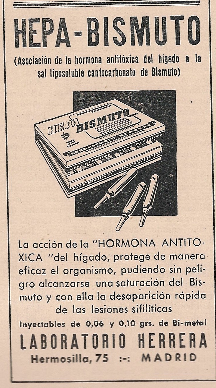 Hepa-Bismuto. Hormona antitóxica del hígado. Sífilis. Laboratorio Herrera. Madrid. Anuncio aparecido en la portada de la revista Gaceta Médica Española. Año 18, número 2, 1944