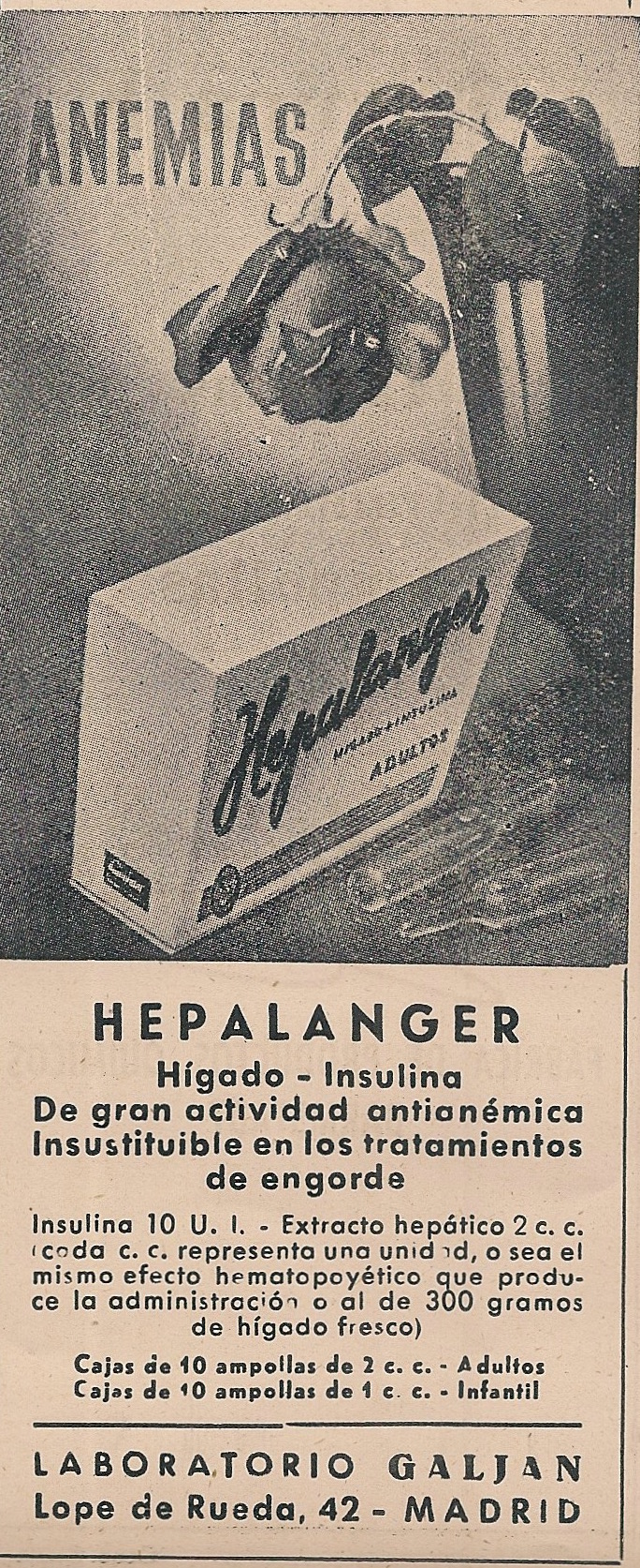 Hepalanger. Hígado, insulina. Antianémico. Insustituible en tratamiento de engorde. Laboratorios Galjan. Madrid. Publicidad aparecida en la revista Gaceta Médica Española, año XIX, número 5. 1945.