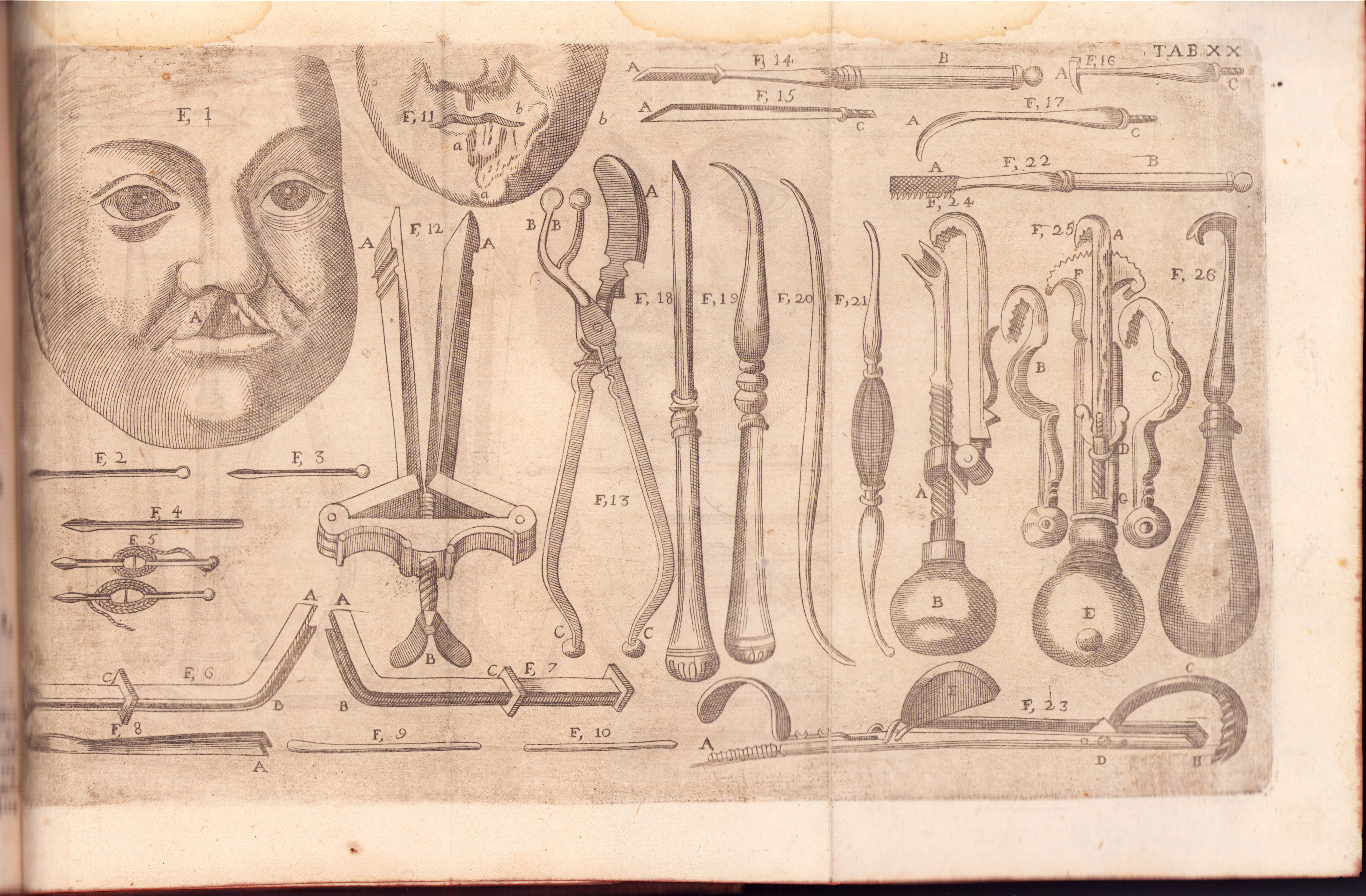 Cabeza de infante con labio leporino, agujas, tenacillas para comprimir las bocas, fibula de Petit, Speculum, diversos instrumentos para limpiar los dientes, odontagra.