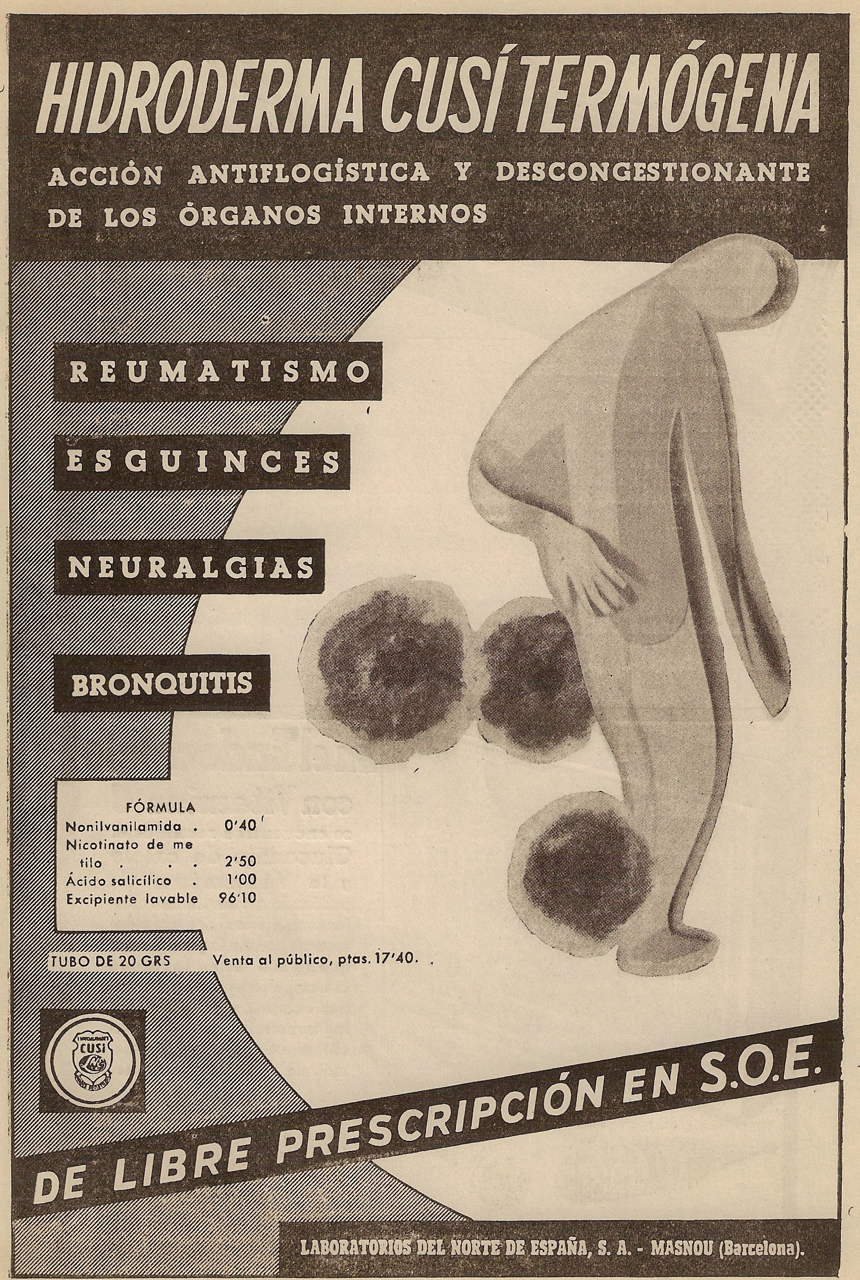 Hidroderma. Acción antiflogística y descongestionante. Reumatismo, Esguinces, neuralgias, bronquitis.Laboratorios del Norte de España, Bacelona. Hispalis Médica, Diciembre 1960.
