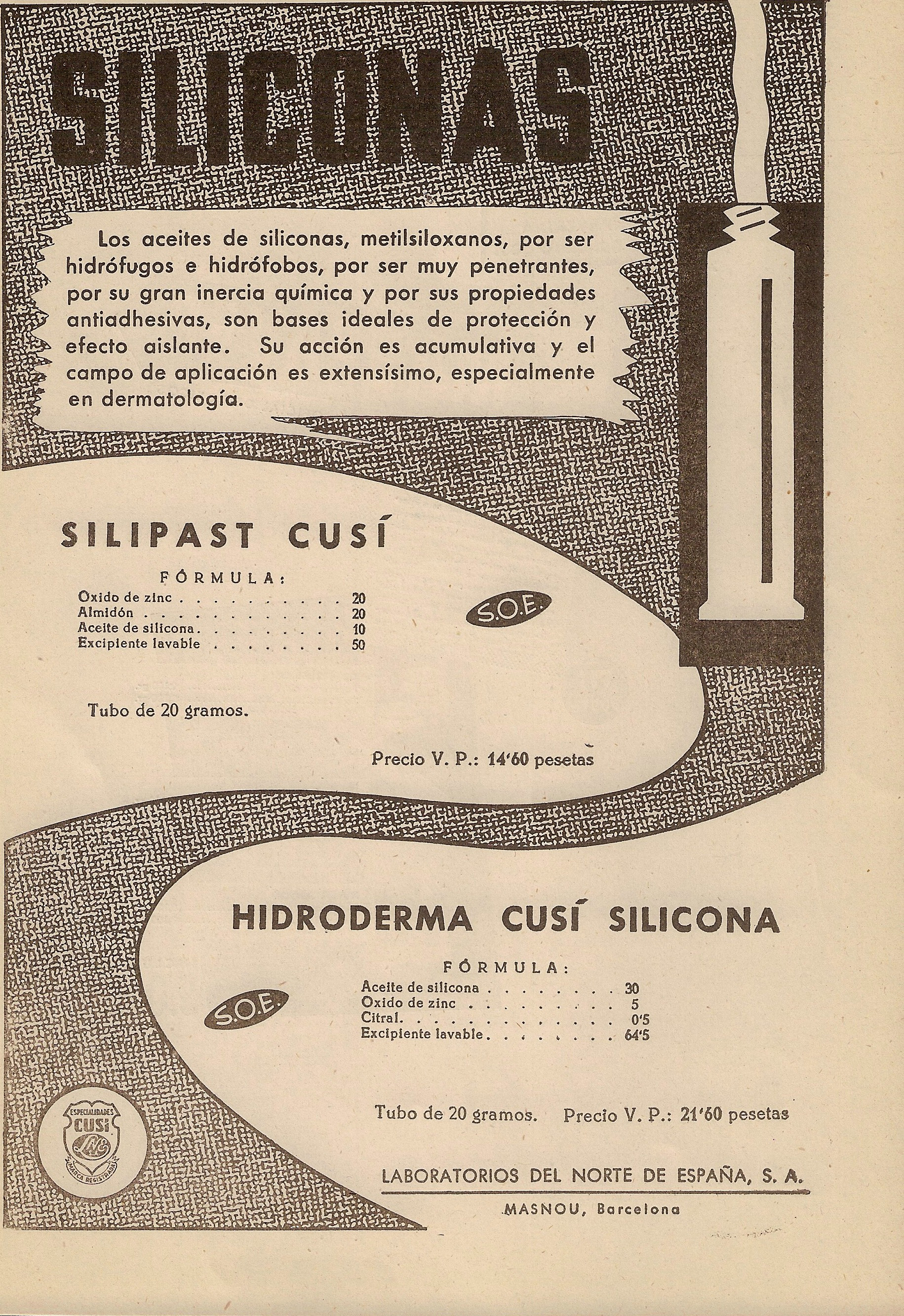 Hidroderma Cusí Silicona, 1958.