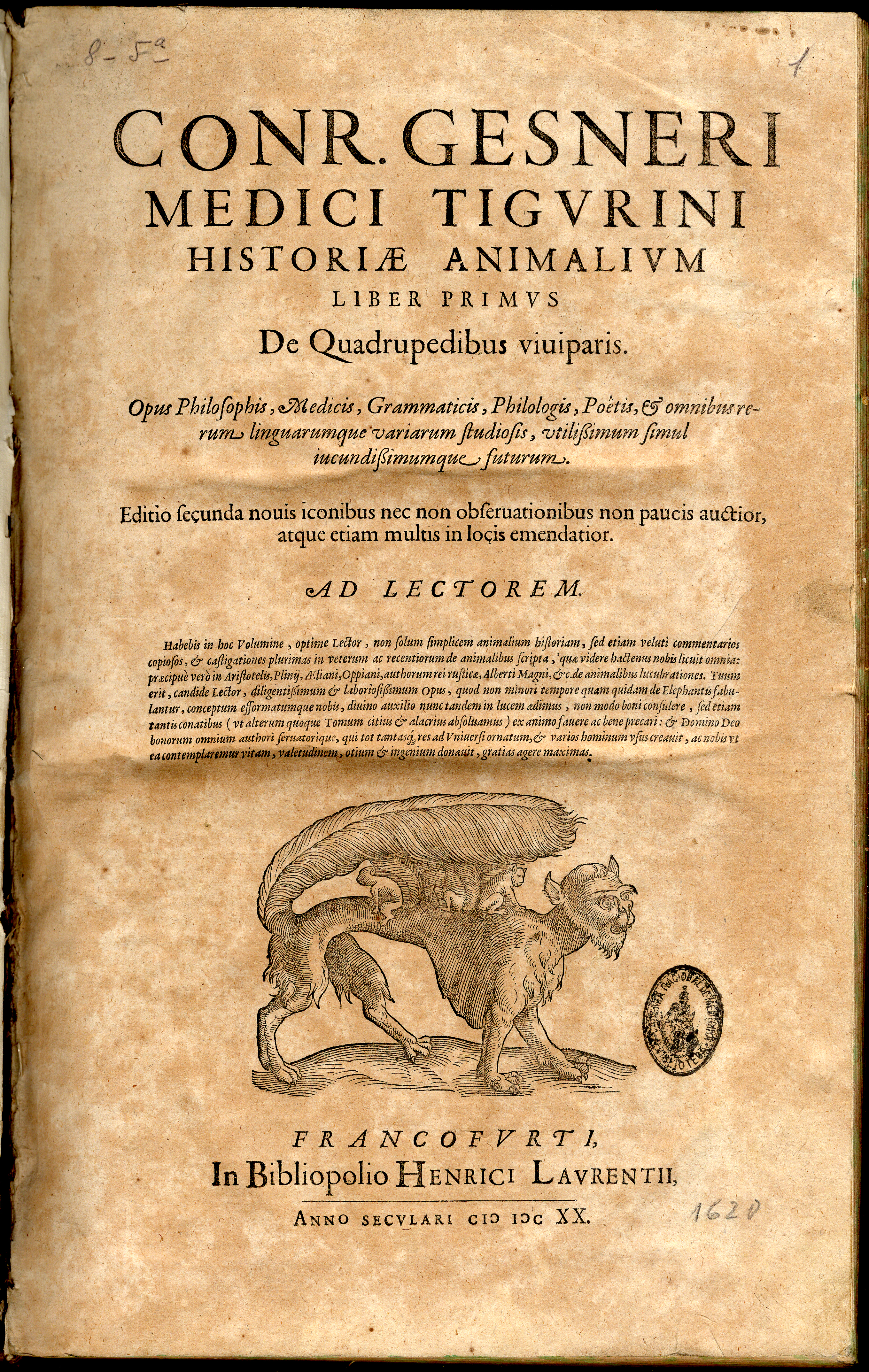 GESNER, Konrad. – Historiae animalium… – Editio secunda… – Francofurti : in Bibliopolio Henrici Laurentii, 1620. – 3 vols. ; Fol.