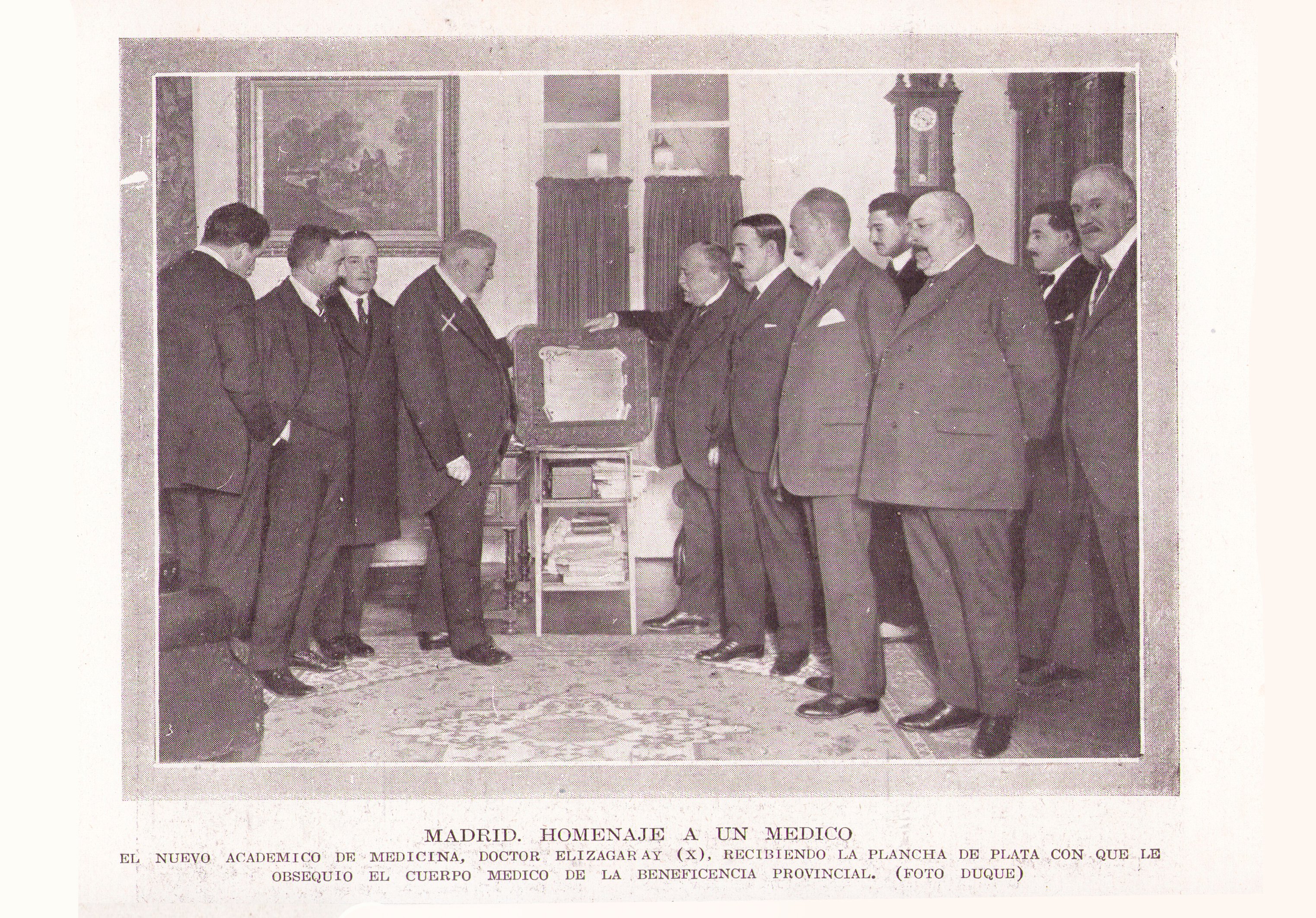 El nuevo Academico de Medicina, Doctor Elizagar (x), recibiendo la plancha de plata con que le obsequio el cuerpo medico de la beneficiencia provincial. (Foto Duque)