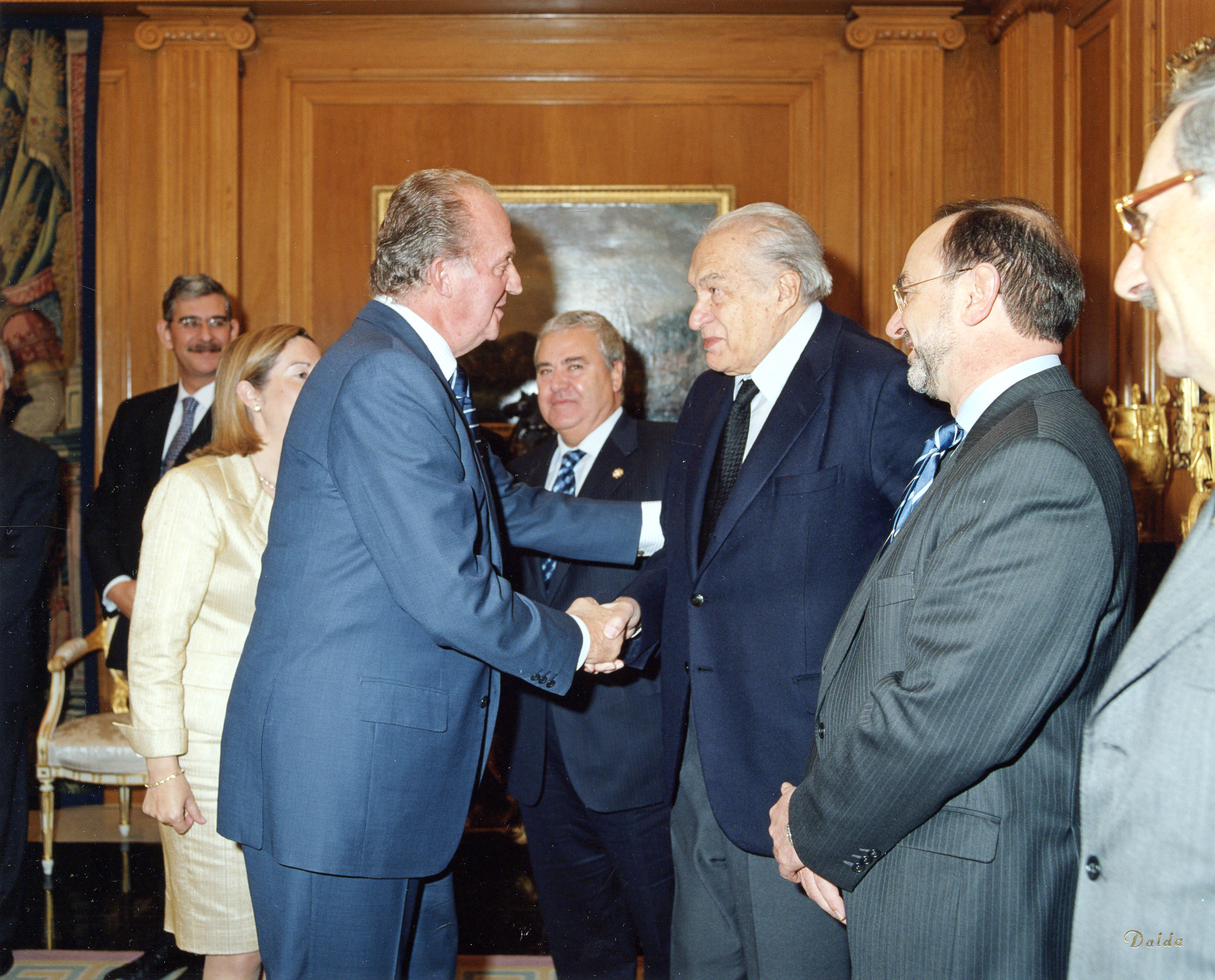 13-04-2004. Homenaje a Xavier Balmis. Recepción de S.M. El Rey a los integrantes de la Comisión. S.M. acompañado de la Ministra de Sanidad, Ana Pastor Julián, saluda al Presidente de la RANM, Prof. Amador Schüller Pérez