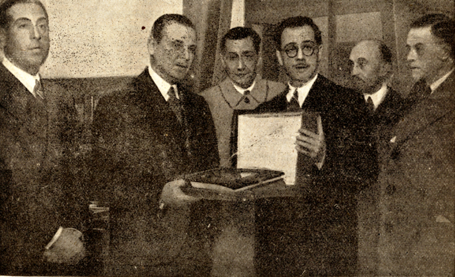 En el despacho del Director General de Sanidad (doctor Palanca, segundo por la izquierda), se celebró un íntimo acto de homenaje a su figura el 23 de Enero de 1942. Consejo General Colegios Médicos España, jan. 1942, p. 29