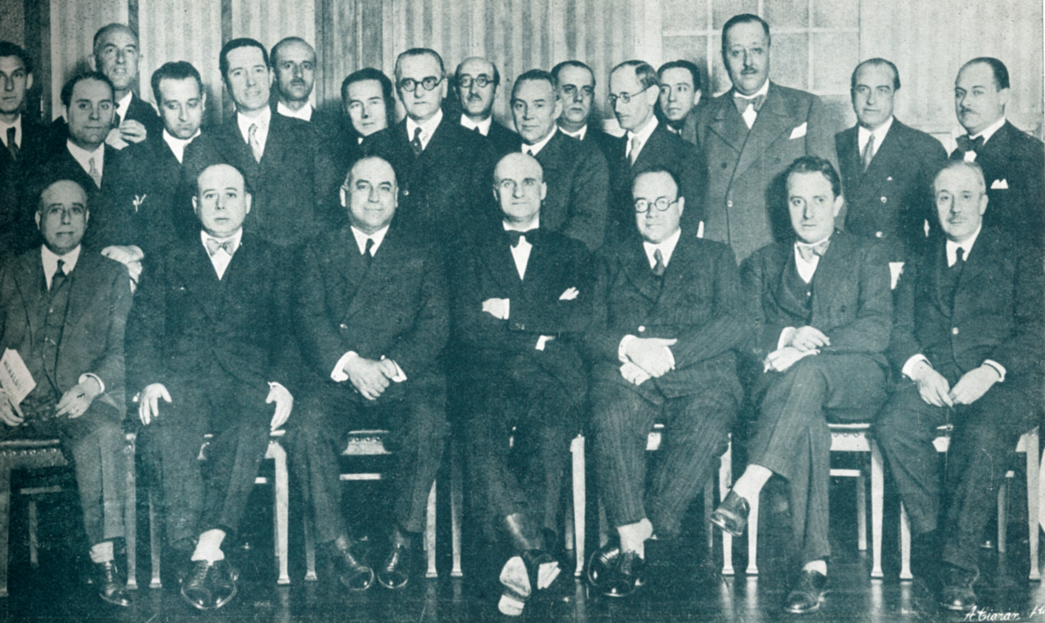 El doctor López Albo, con un grupo de los compañeros y amigos que le obsequiaron con un banquete, testimoniándole su simpatía por la organización de la Casa de Salud de Valdecilla, de Santander. Concurrieron también a este acto los doctores Marañón y Banús, y, de sobremesa, el ministro de Hacienda, D. Indalecio Prieto. Gaceta Médica Española, 56, May. 1931