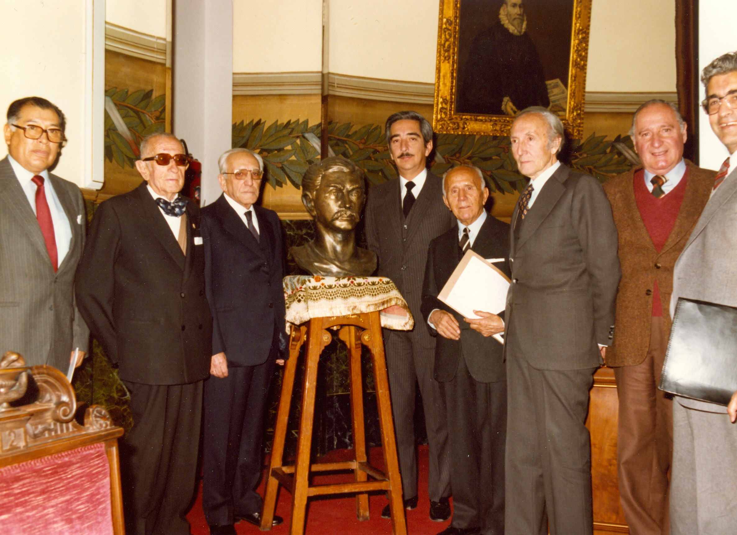 Homenaje Dr. Daniel Alcides Carrión 26 de Noviembre 1985. Profesores Benigno Lorenzo Veláquez, José Gómez Orbaneja, D Carlos Cornejo Brandon (Encargado Negocios Embajada del Perú) Prof. Valentín Matilla Gómez, Prof. Mariano Fernández Zumel, Prof. Bonifacio Piga y Sánchez Morata, Prof. D. Francisco Alonso Fernández
