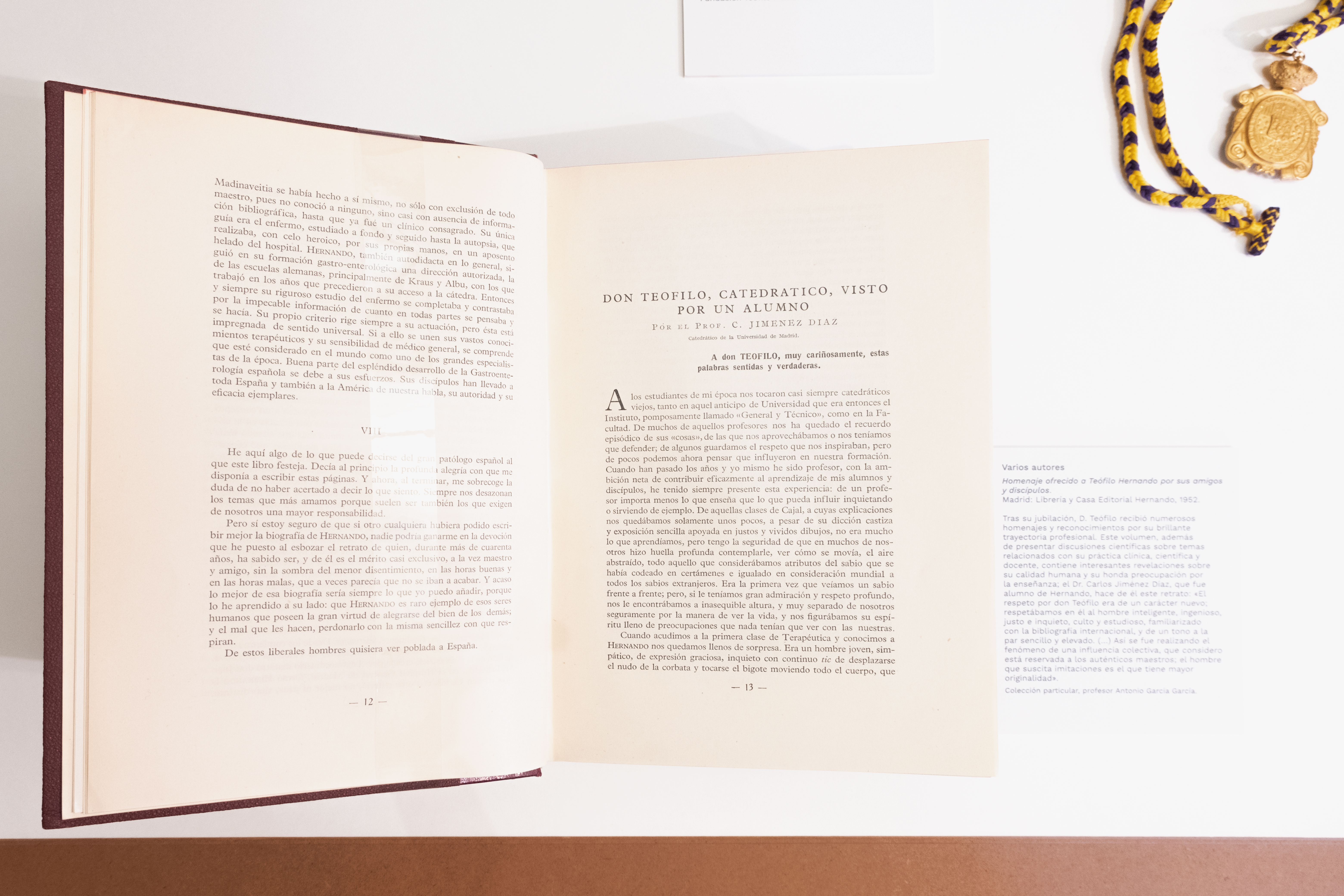 Tras su jubilación, D. Teófilo recibió numerosos homenajes y reconocimientos por su brillante trayectoria profesional. Este volumen, además de presentar discusiones cientificas sobre temas relacionados con su práctica clinica, cientifica y docente, contiene interesantes revelaciones sobre su calidad humana y su honda preocupación por la enseñanza; el Dr. Carlos Jiménez Diaz, que fue alumno de Hernando, hace de el este retrato: «El respeto por don Teófilo era de un carácter nuevo; respetábamos en él al hombre inteligente, ingenioso, justo e inquieto, culto y estudioso, familiarizado con la bibliografia internacional, y de un tono a la par sencillo y elevado. (…) Así se fue realizando el fenómeno de una influencia colectiva, que considero está reservada a los auténticos maestros; el hombre que suscita imitaciones es el que tiene mayor originalidad».