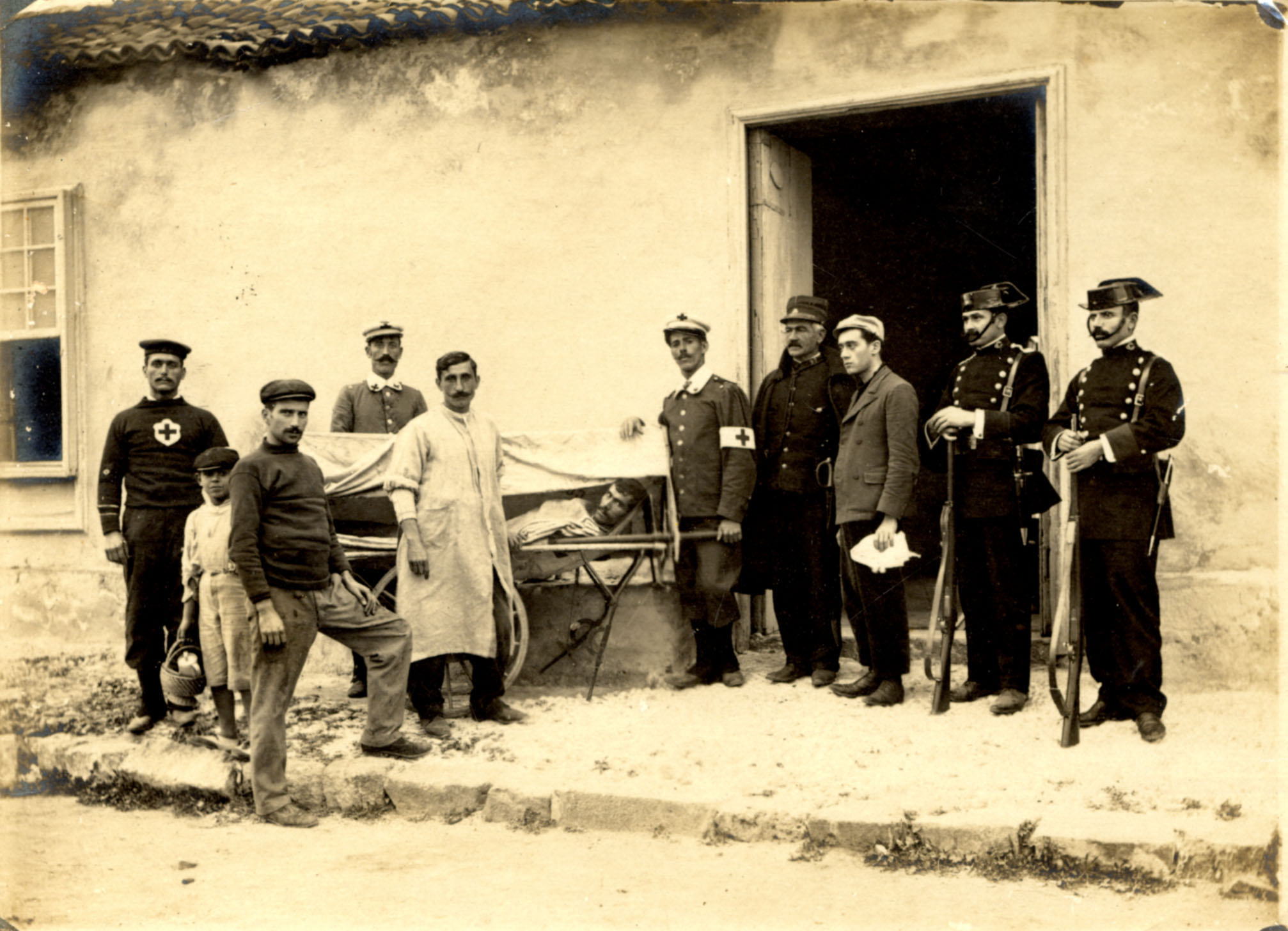 Hospital “El Lazareto” de Santa Cruz de Tenerife. Barrio de El Cabo. Miembros de la Benemérita y Cruz Roja, enfermeros y enfermo en camilla. 1918.