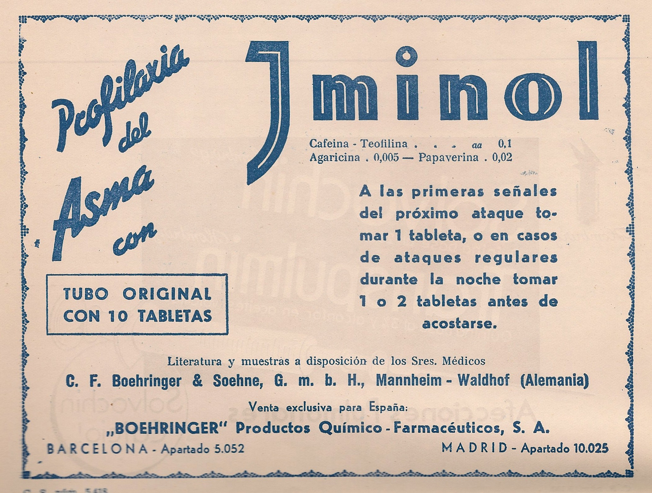 Iminol. Cafeína, teofilina, agaricina, papaverina. Profilaxis del asma. Boehringer. Barcelona. Madrid. Publicidad aparecida en la revista Gaceta Médica Española. Año 18, número 3, 1944