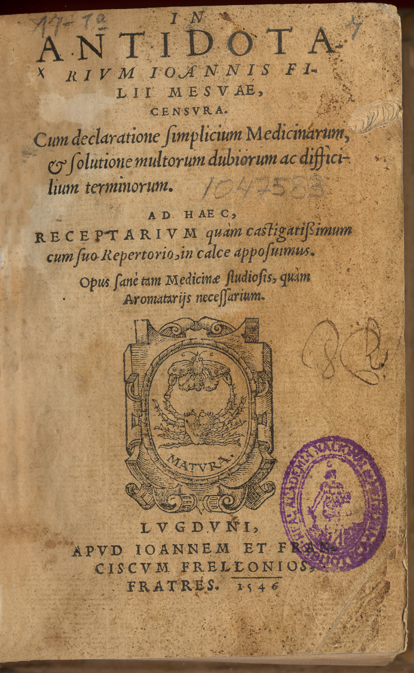 MESUE, Joannes (m. 1015). — In antidotarium. — Lugduni : apud Ioannem et Franciscum Frellonios, 1546. — 622, 34 p. ; 8º (16 cm). – Perg.