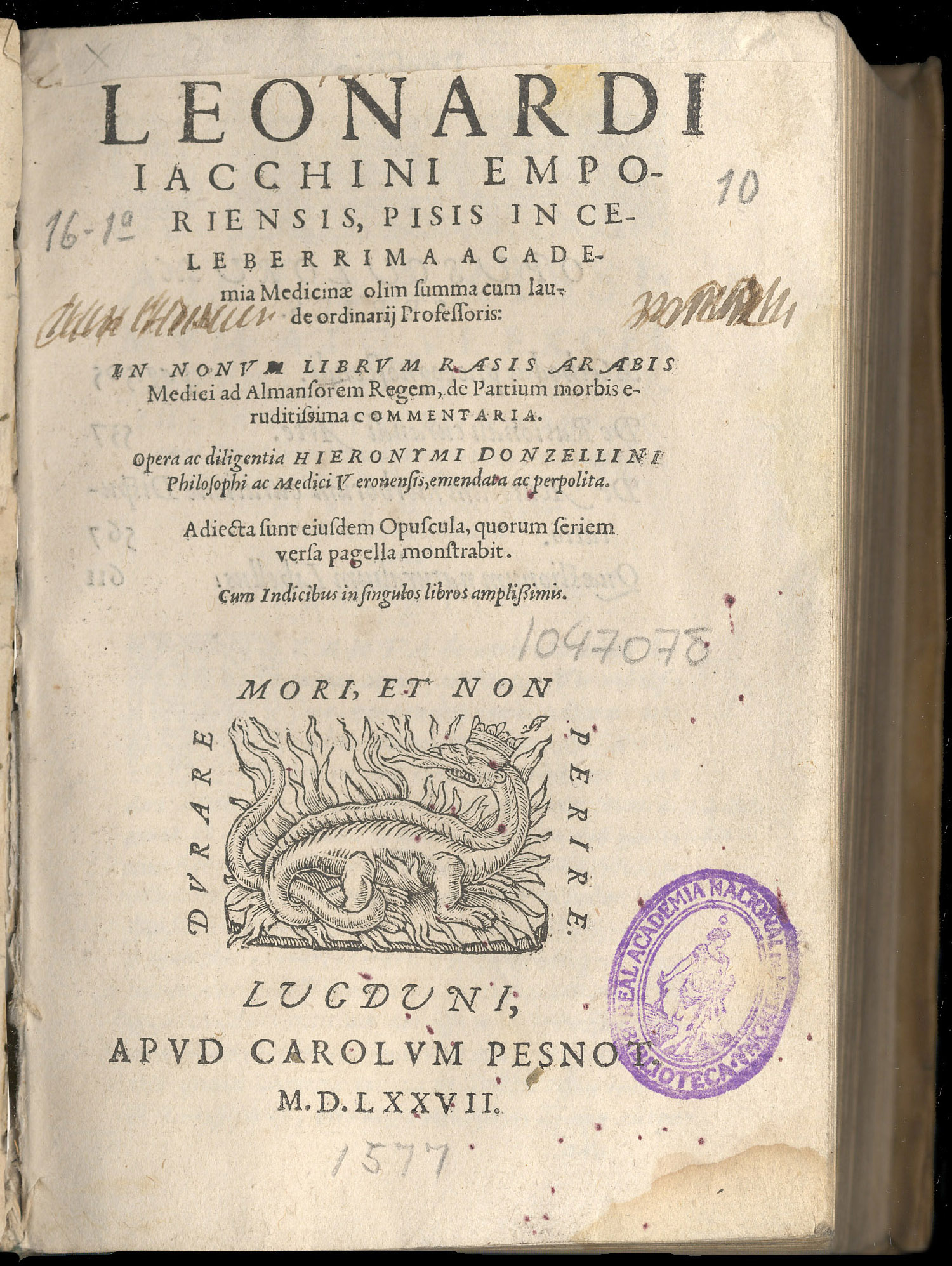 GIACCHINI, Leonardo. – In nonum librum Rasis arabis […] comentaria. — Lugduni [Lyon] : apud Carolum Pesnot, 1577. — 640 [30] p. ; 8º (17 cm). – Perg.