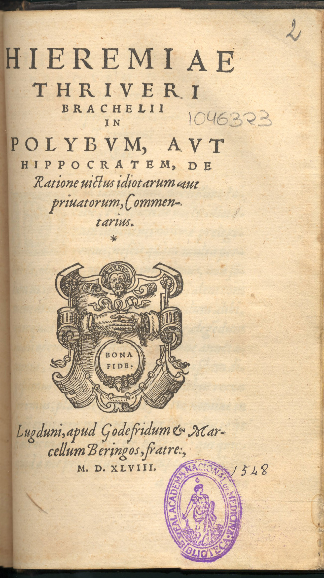 DRYVÈRE, Jérémie de (1504-1554) – In Polybum, aut Hippocratem, de ratione victus idiotarum aut privatorum commentarius. – Lugduni : Apud Godefridum & Marcellum Beringos, 1548. – 59 p. ; 8º (17 cm). – Piel.