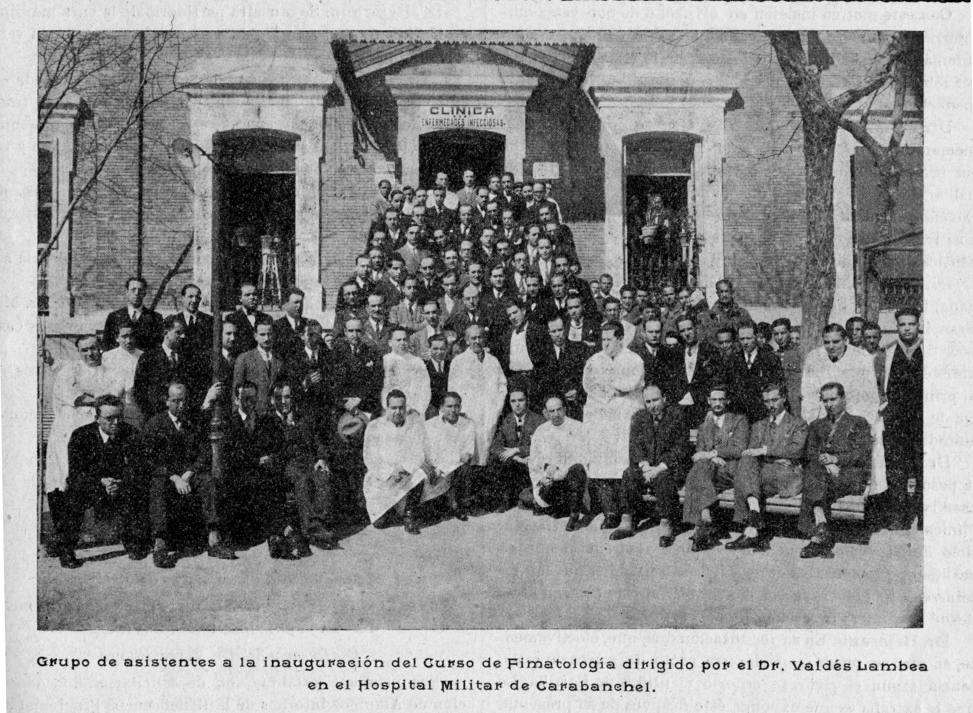 Grupo de aistentes a la inauguración del Curso de Fimatología dirigido por el Dr. D. José Valdés Lambea en el Hospital Militar de Carabanchel (Madrid). Marzo 1931. El Siglo Médico, T. 87, 1931, pag. 311