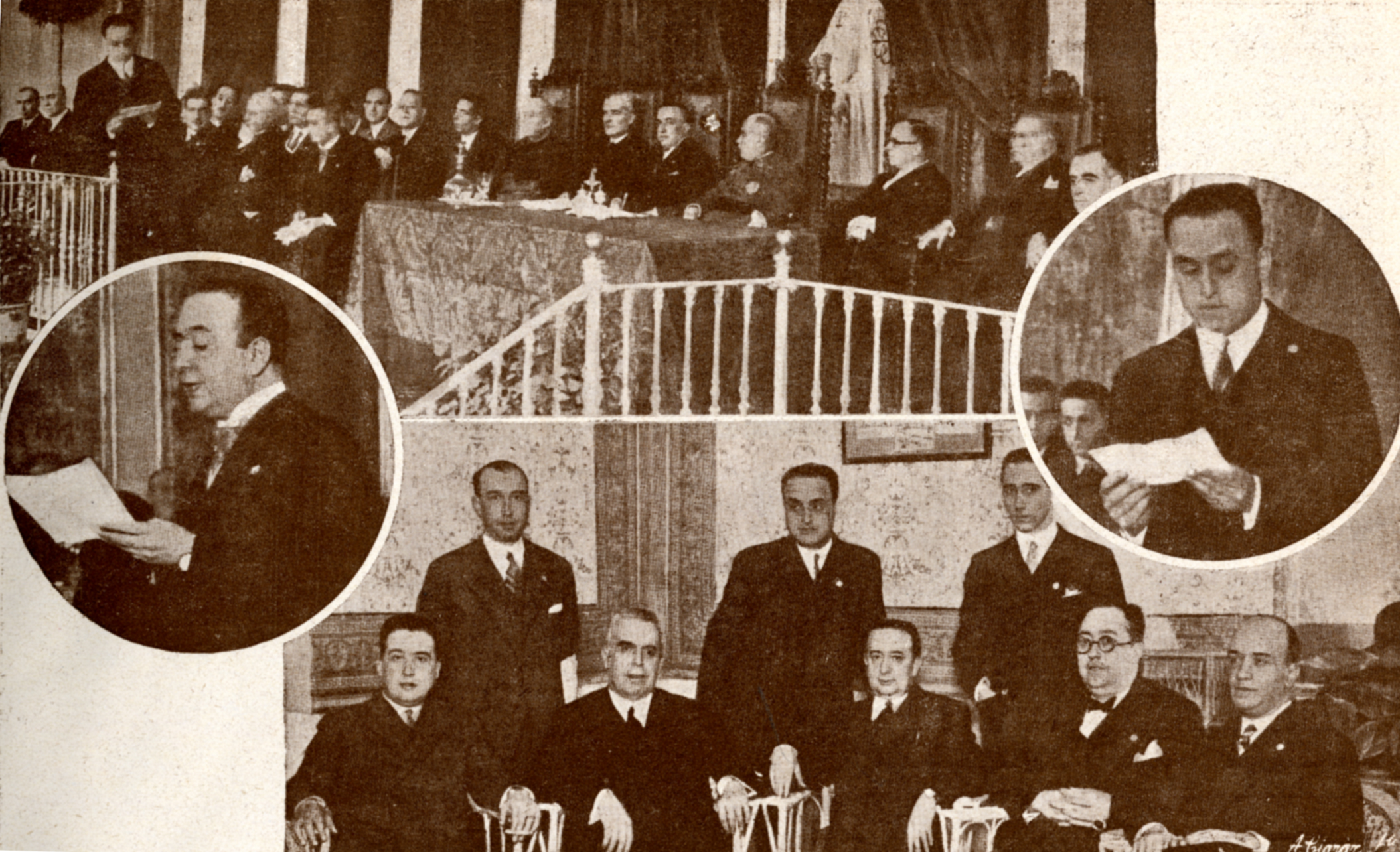 En óvalos : Los doctores Rodríguez Fornos (iz.) y Orero, leyendo sus discursos. Inferior : Presidentes y Secretarios de las Secciones. Gaceta Médica Española, 55, Apr. 1931