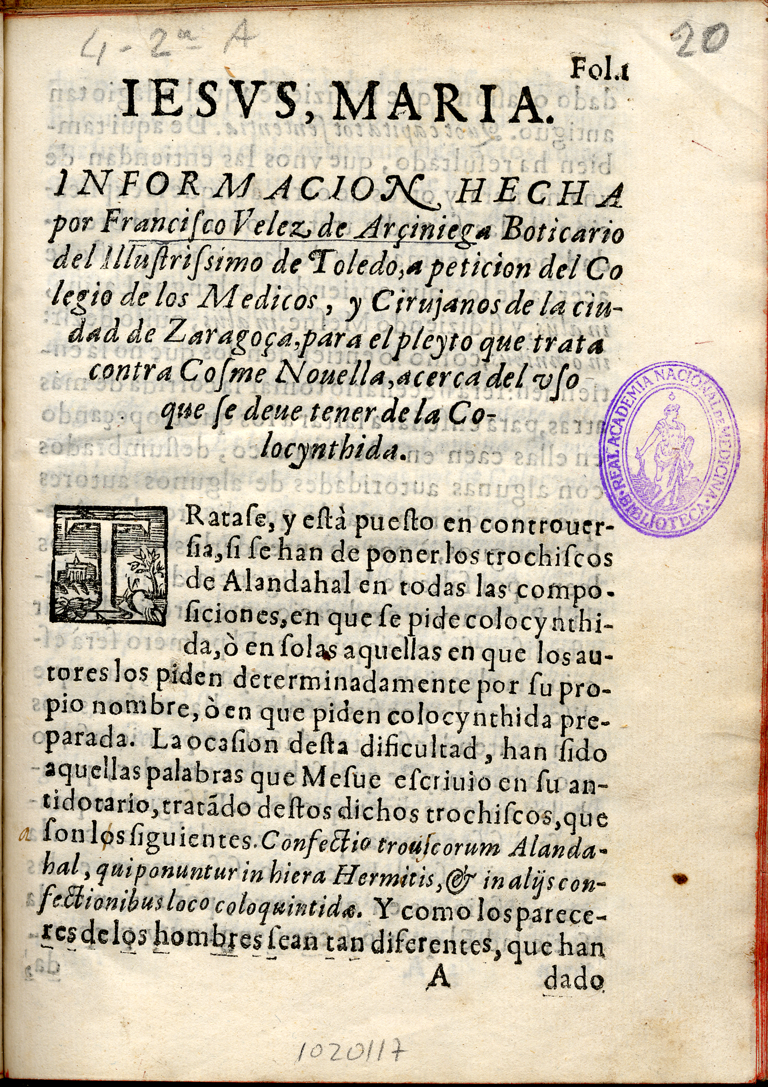 VÉLEZ DE ARCINIEGA, Francisco. – Información hecha por Francisco Vélez de Arciniega… a petición del Colegio de los Médicos y Cirujanos de…Zaragoza, para el pleyto que trata contra Cosme Novella, acerca del uso que se deve tener de la colocynthida. – [¿Zaragoza?]: [s.a.], 1611. – 16 h. ; 4º