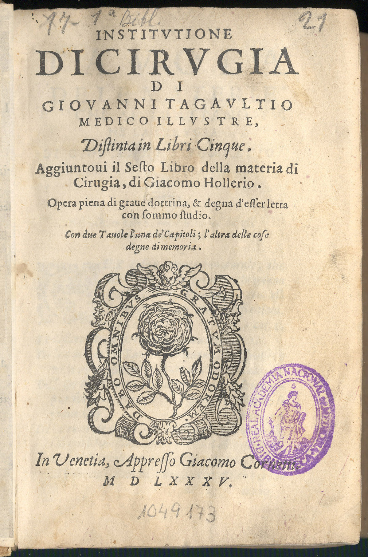 TAGAULT, Jean (m. 1545). – Institutione di cirugia… – In Venetia : appresso Giacomo Cornetti, 1585. – [19], 421 h. ; 8º (15 cm). – Perg.