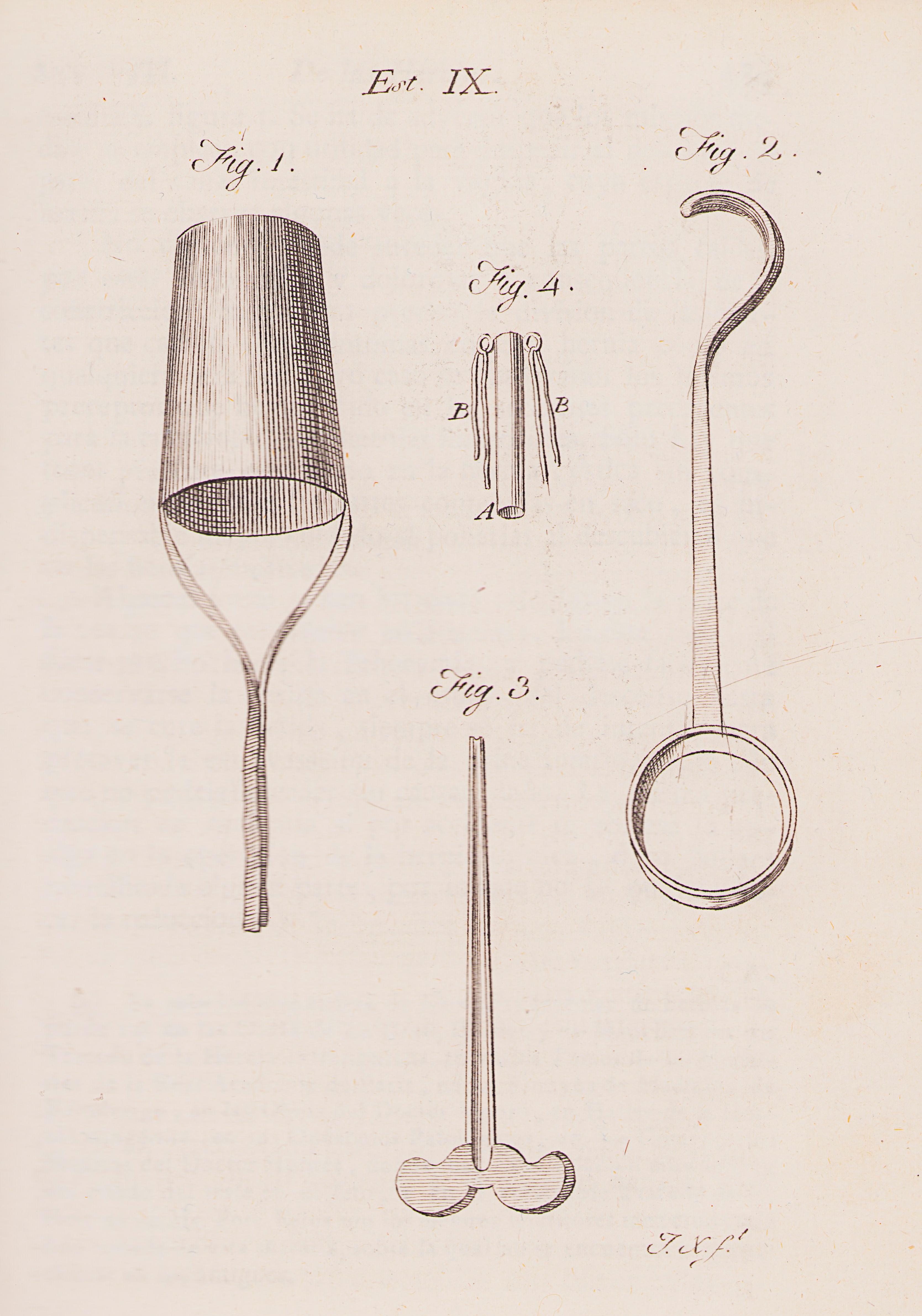 Lámina novena: Figura 1:Un pesario para precaver las hernias que se forman en la vagína. Figura 2: Gancho para dilatar la apertura del agujero oval. Figura 3: Conductor abierto en su extremidad. Figura 4: Cánula de plata para introducir en la uretra después de la amputacion del pene.