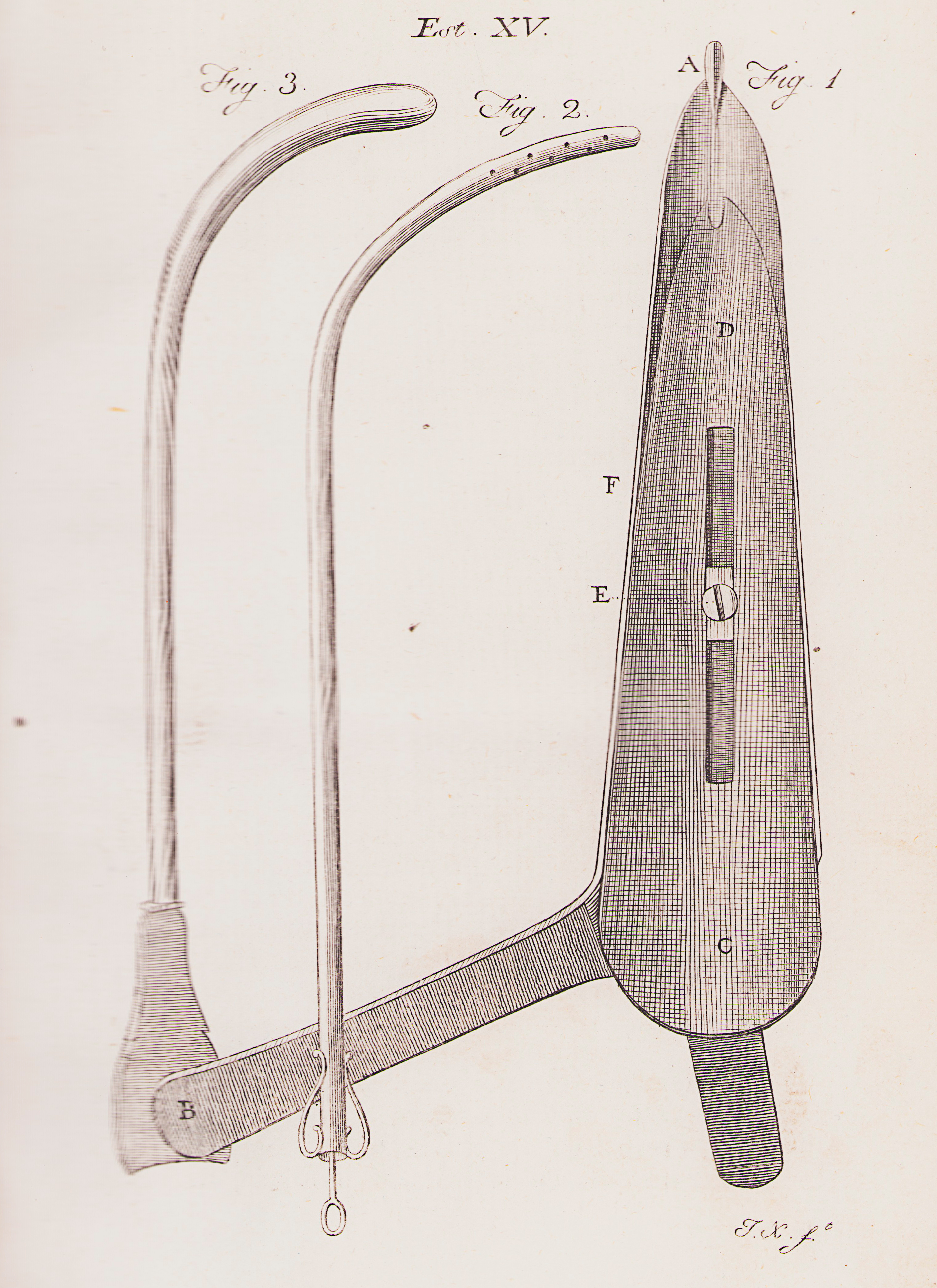 Lámina 15:Representa el gorget corregido por el doctor Monró. Figura 2: Cateter de plata para hombres.