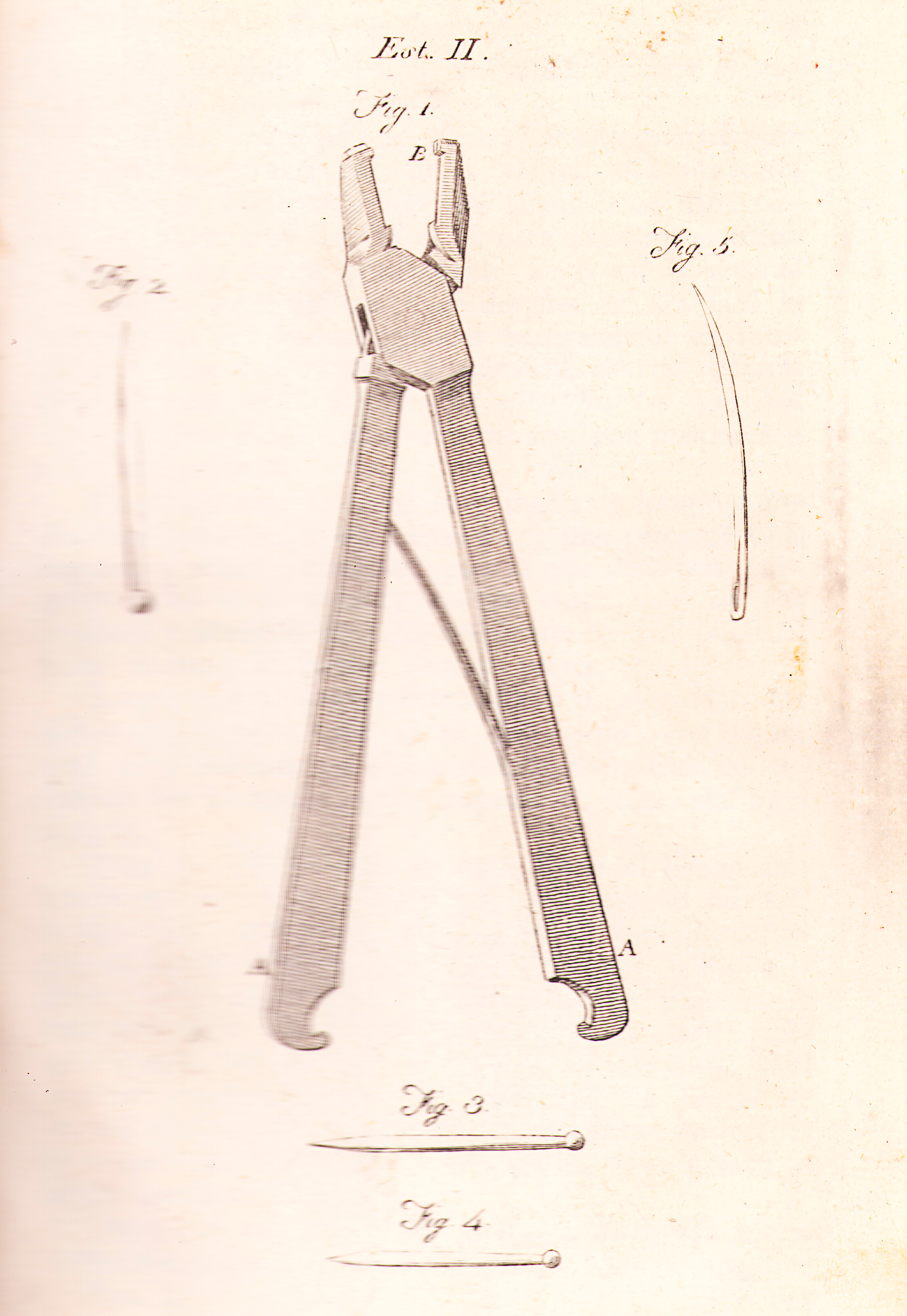 Lámina segunda: Figura 1: porta-agujas, A los brazos del instrumento, B una muesca para recibir los alfileres.Figura 2, 3 y 4: Diferentes alfileres para suturas. Figura 5:Aguja plana.