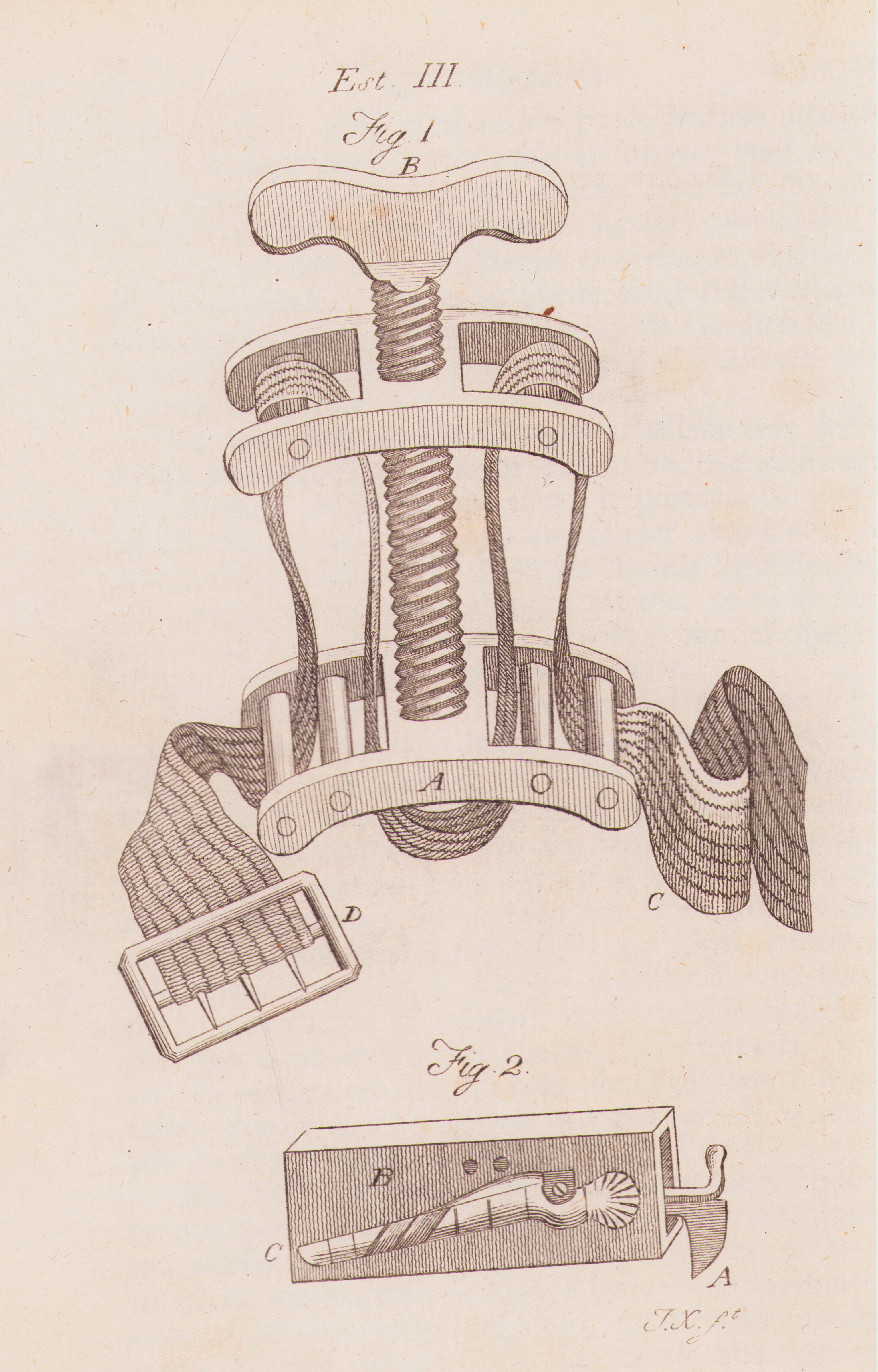 Grabado perteneciente al libro “Sisitema o curso completo de cirugia por el célebre Benjamin Bell” Tomo 1, Sutura, ligadura de las arterias, sangrías, aneurisma, hernias, hidrocele, varicocele y enfermedades del pene.