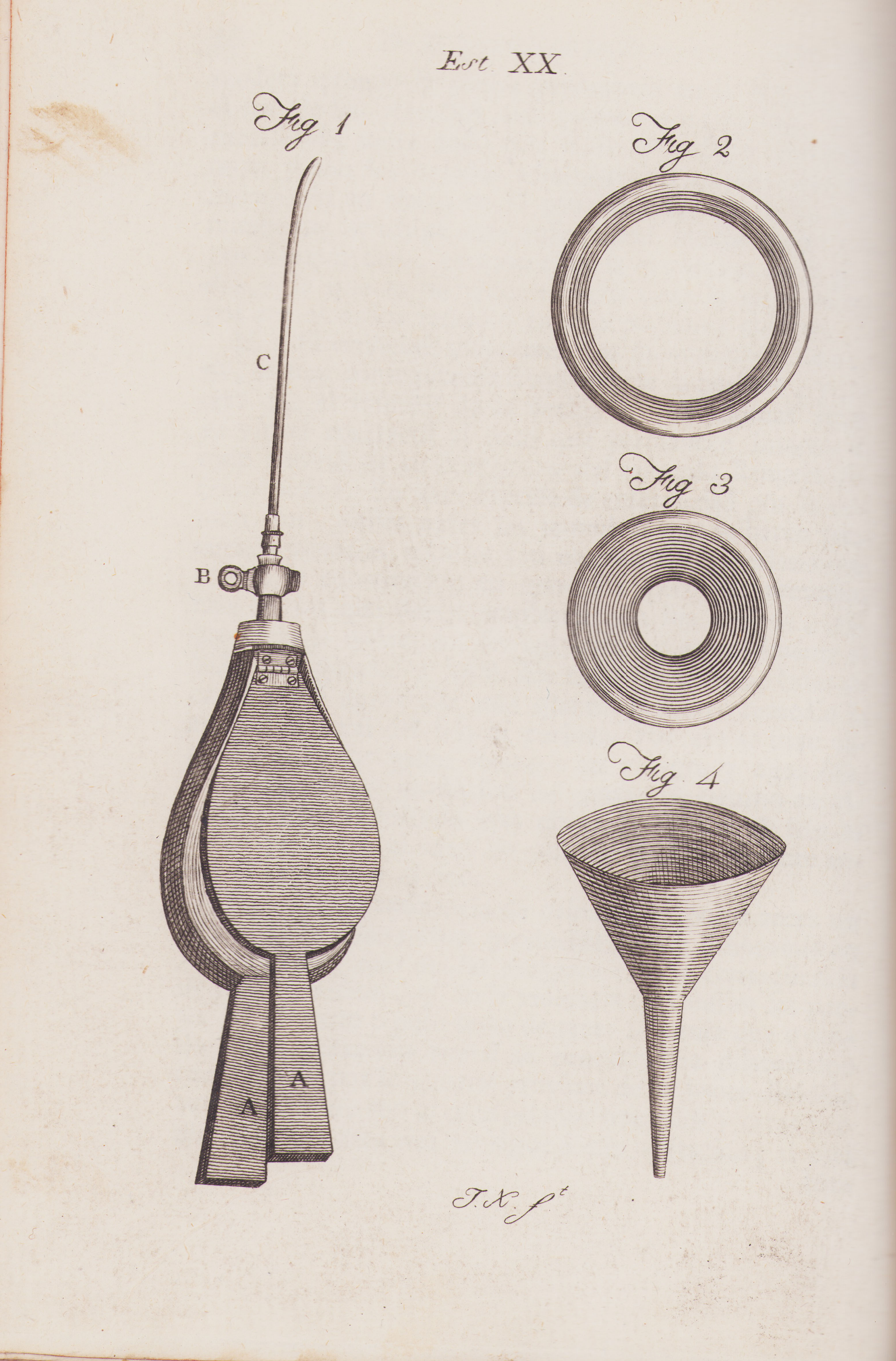 Lámina 20: Figura 1: Instrumento inventado por Dr. Butter para inyectar los líquidos en la vejiga. Figura 2 y 3: Pesarios para sostener las partes caidas en la procidencia del útero, y comprimir la uretraen la incontinencia de la orina.Figura 4: Embudo que lleva liquido a la vejiga.
