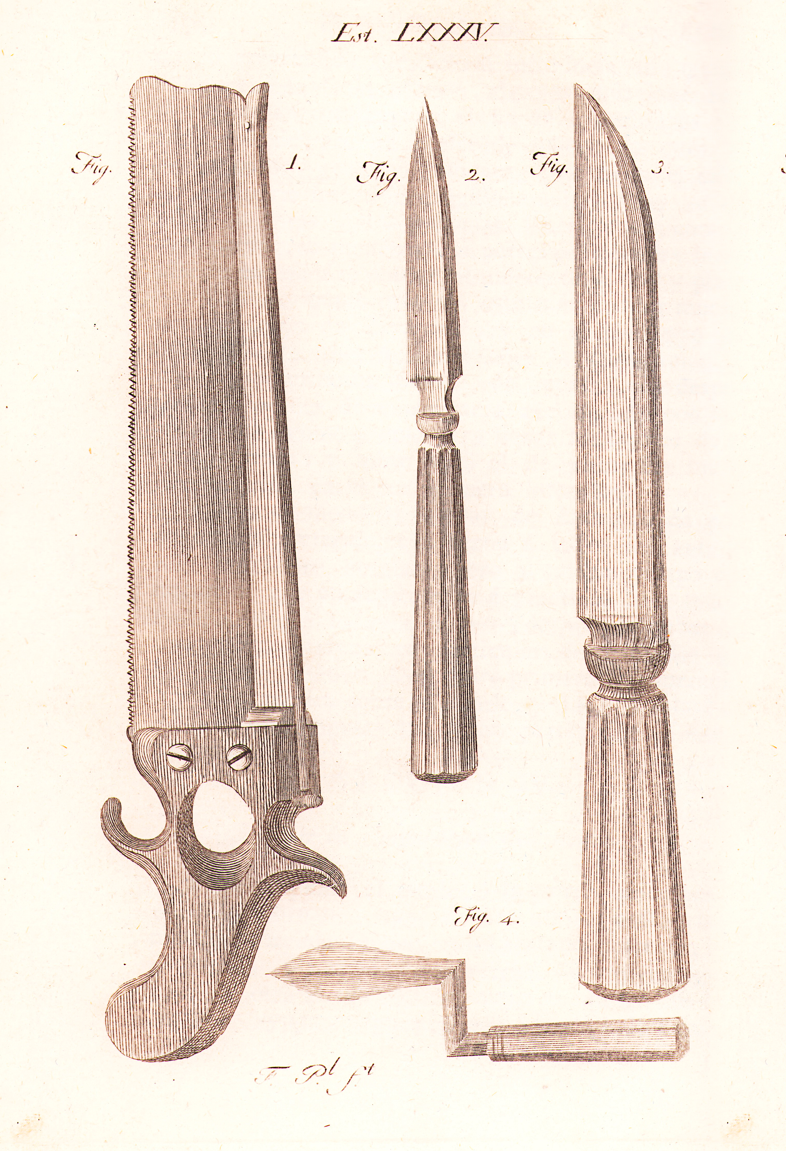 Lámina 85: figura 1: Sierra que utiliza Benjamin Bell para la amputación de piernas y brazos.Figura 2:Cuchillo de dos cortes, interoseo, para dividir ligamentos.Figura 3: Cuchillo de amputar conveniente para el muslo.