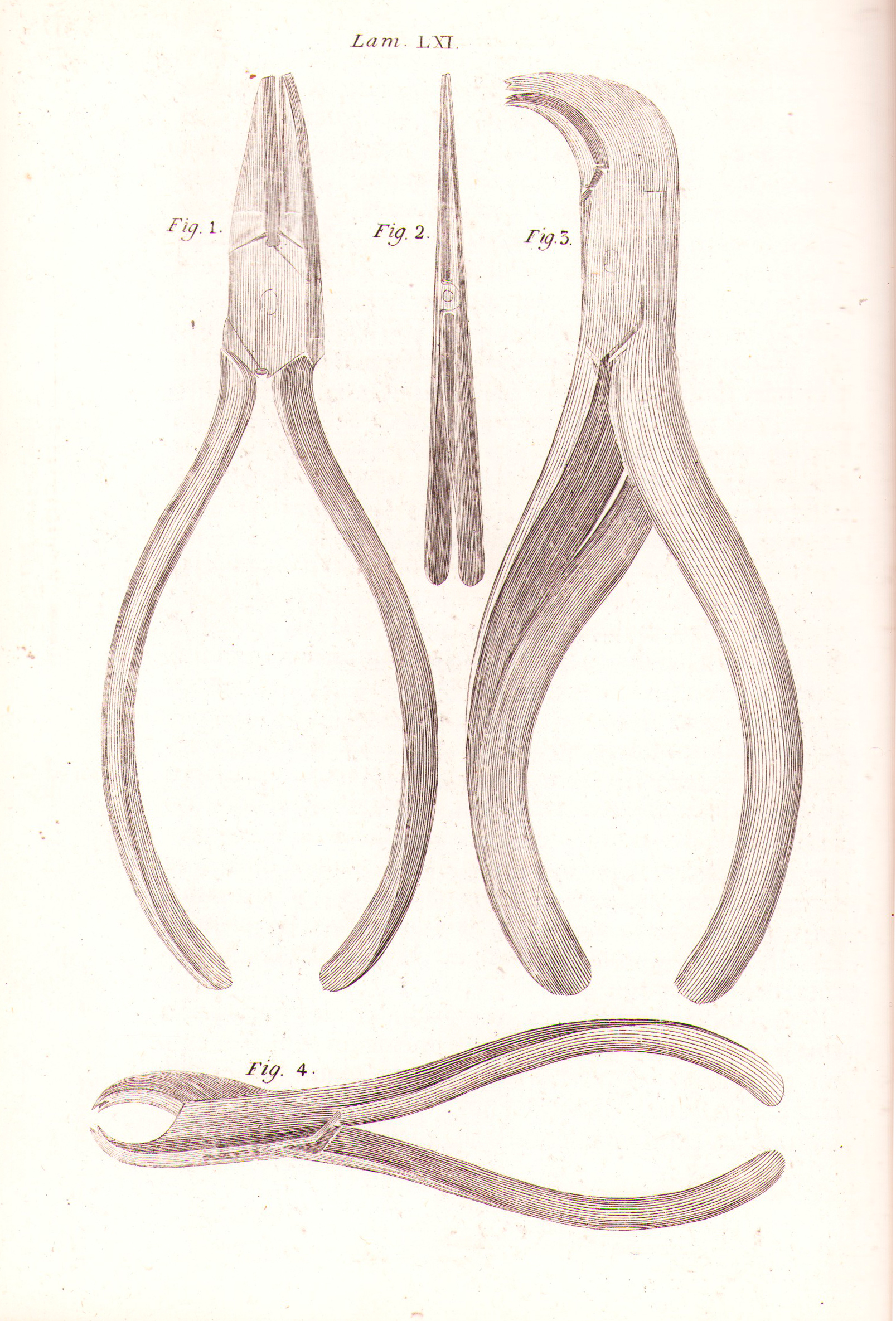 Lámina 61: Fig 1, 2, 3 y 4 diferentes formas de tenazas o gatillos para arrancar los dientes, la fig. 3 es quizá la mejor.Figura 2: Tenacillas o pinzas para operaciones de la boca.