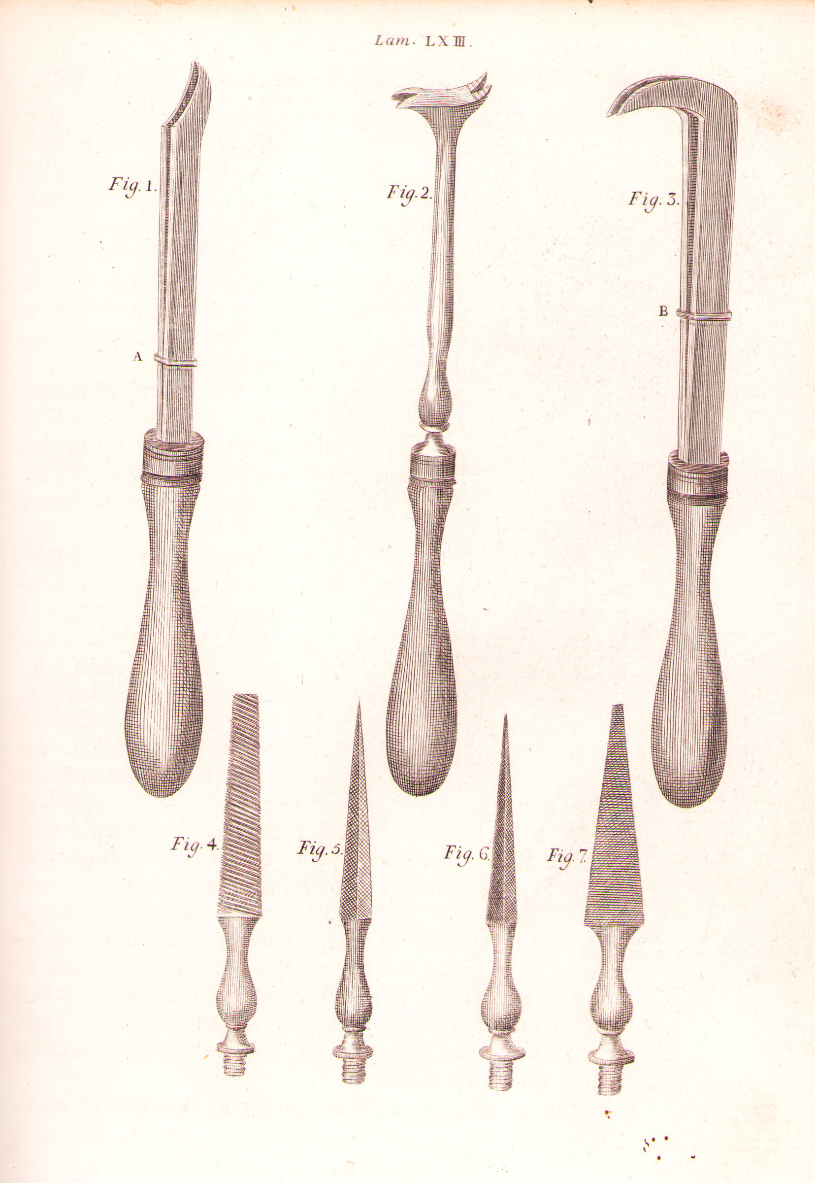 Lámina 63: Fig 1, 2, 3, diferentes formas de punzón o planca para extraer los raigones de los dientes. Fig 4, 5, y 6 diferentes formas de limas para destruir las desigualdades de los dientes.