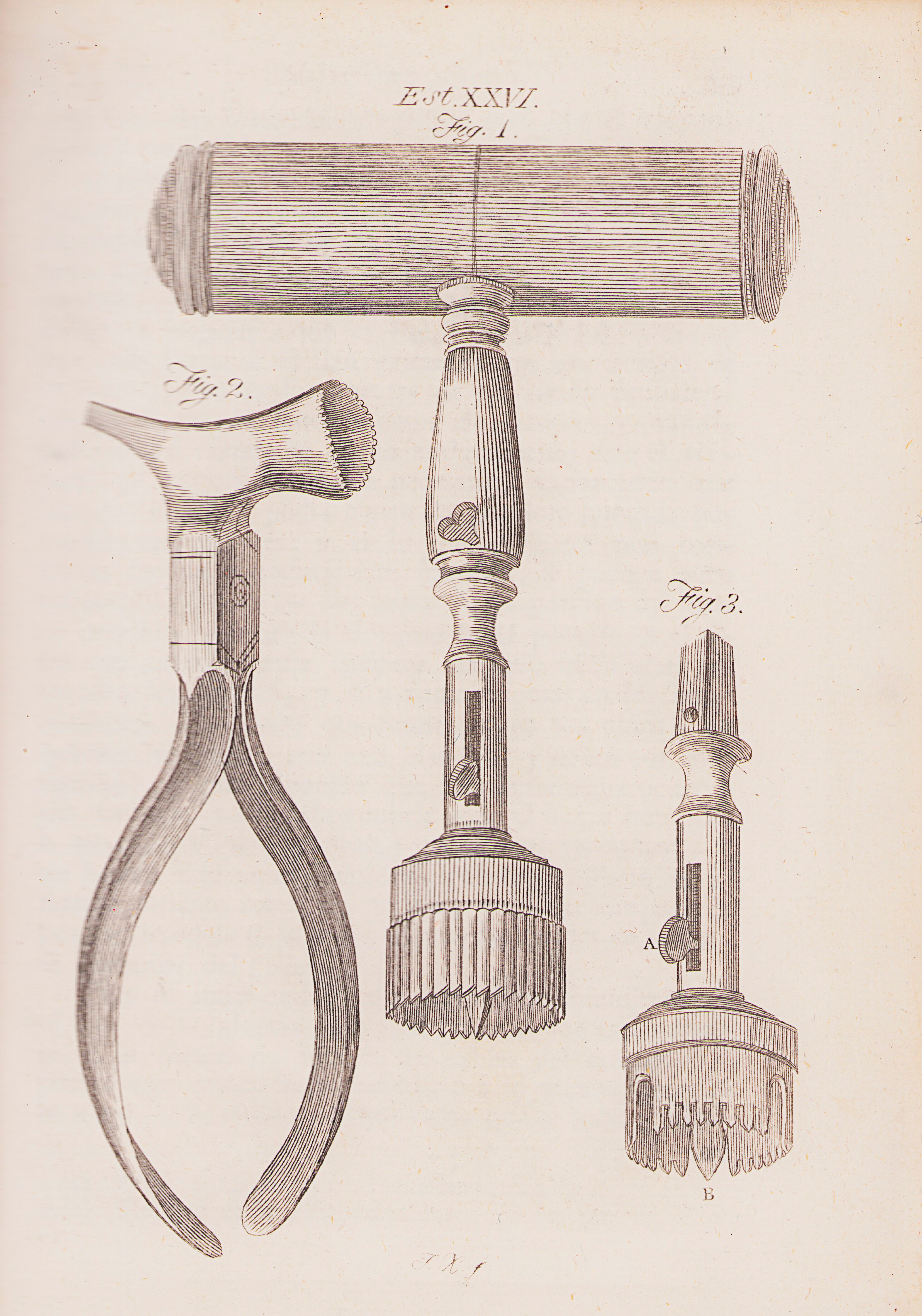 Lámina 26: Figura 1: Representa todas las partes del trefine unidas y dispuestas para el uso. Figura 2:Tenacillas o pinzas para quitar las porciones desprendidas de cráneo fracturado.Figura 3: Corona de trefine con dientes más largos que los del instrumento que se usa de ordinario.